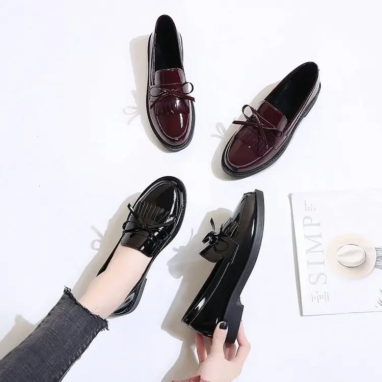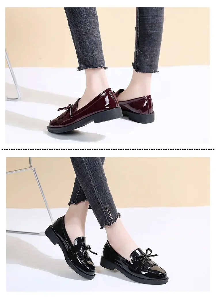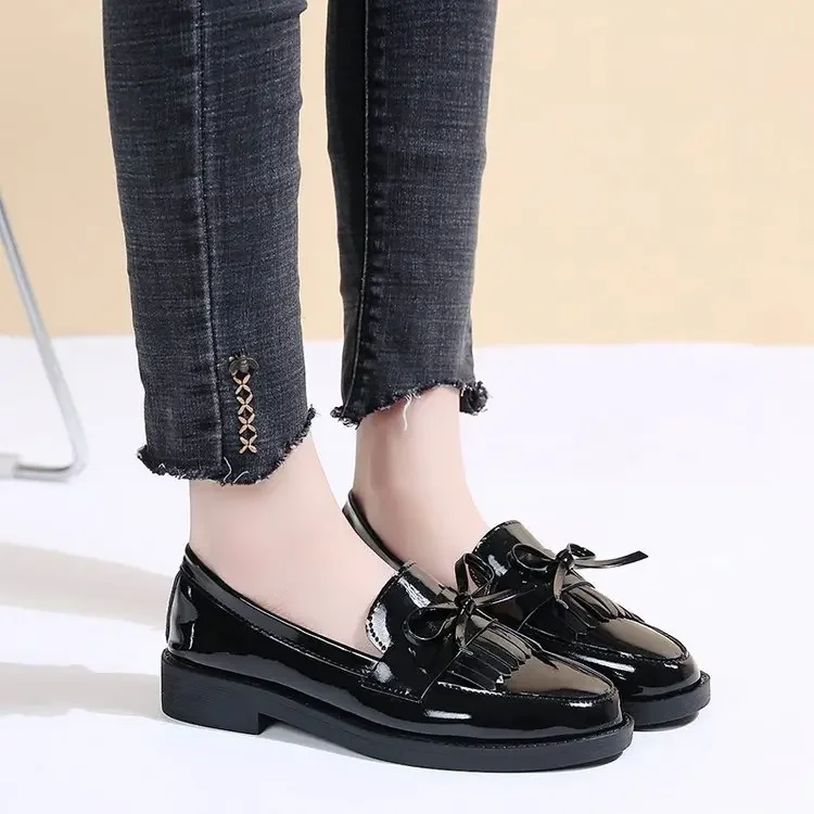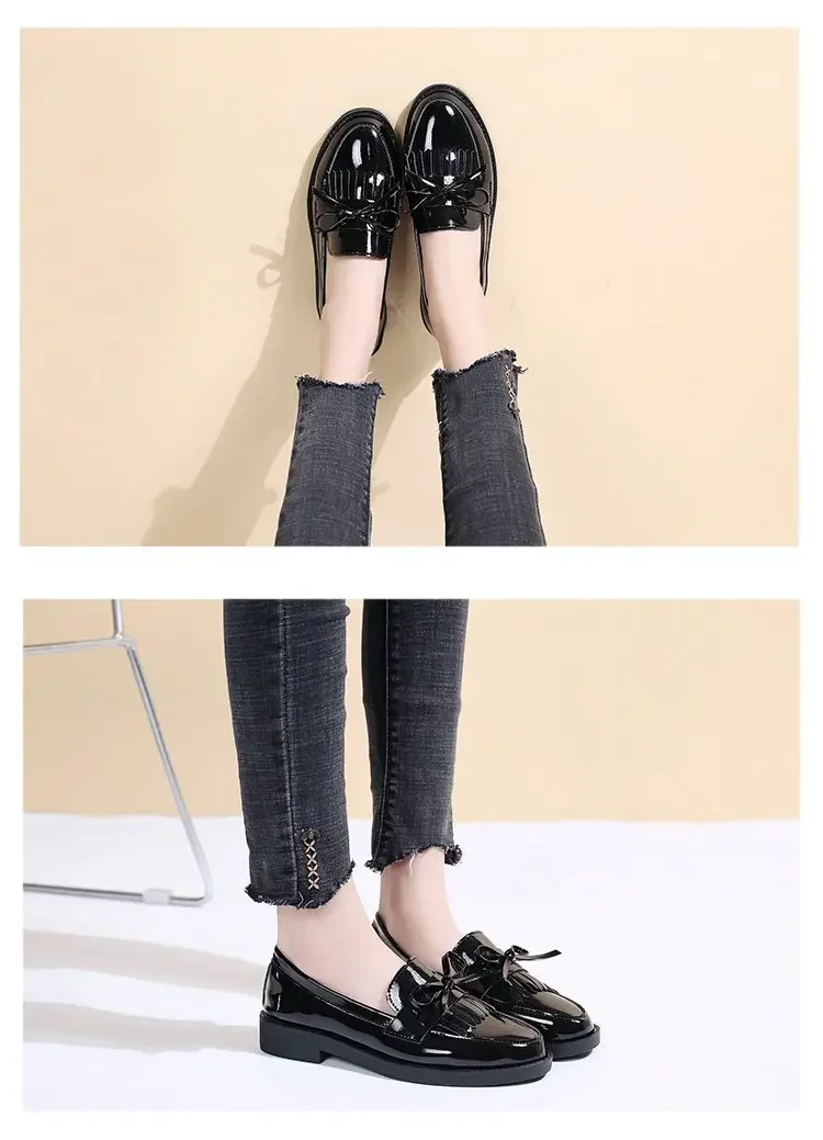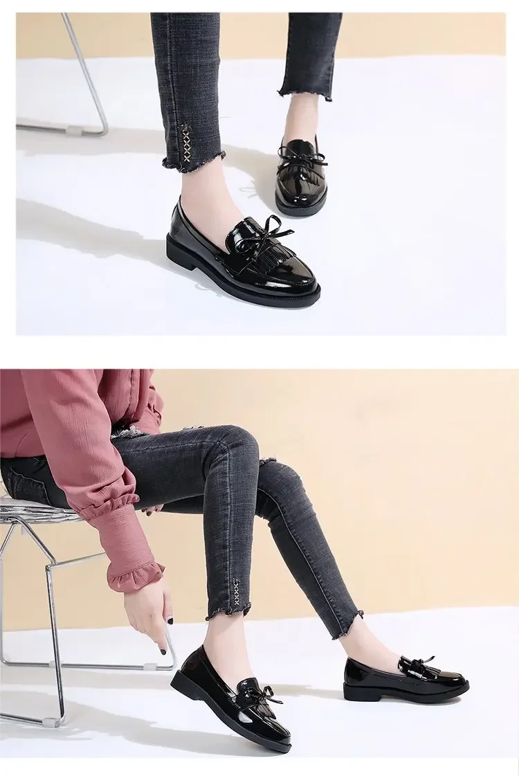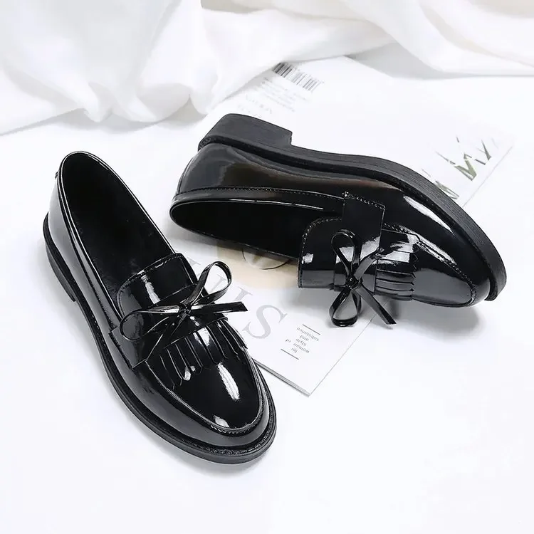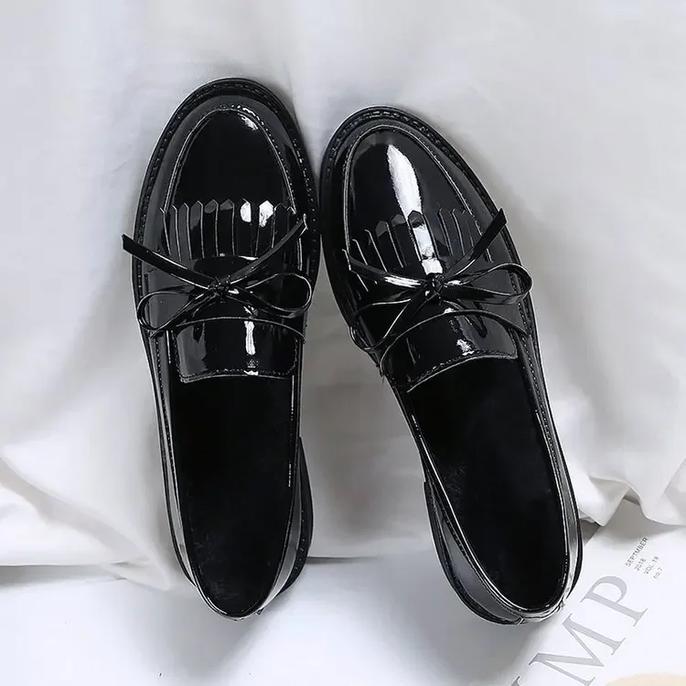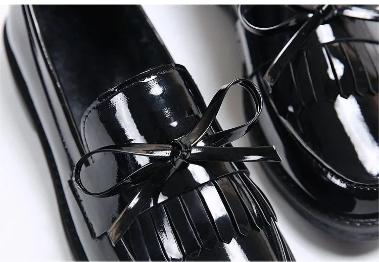 Mocassini da donna in pelle verniciata nera con plateau, scarpe slip on da donna, nuove scarpe basse casual con fiocco e nappa britannica primaverile