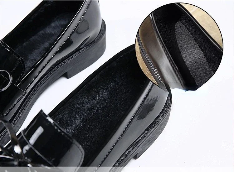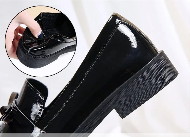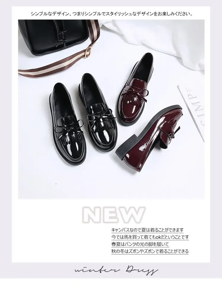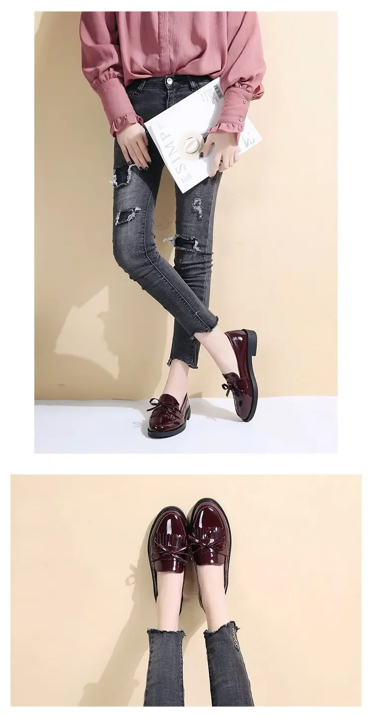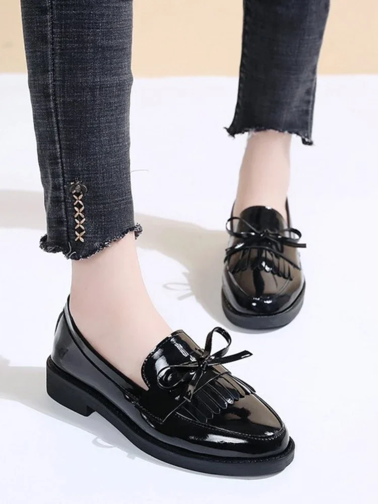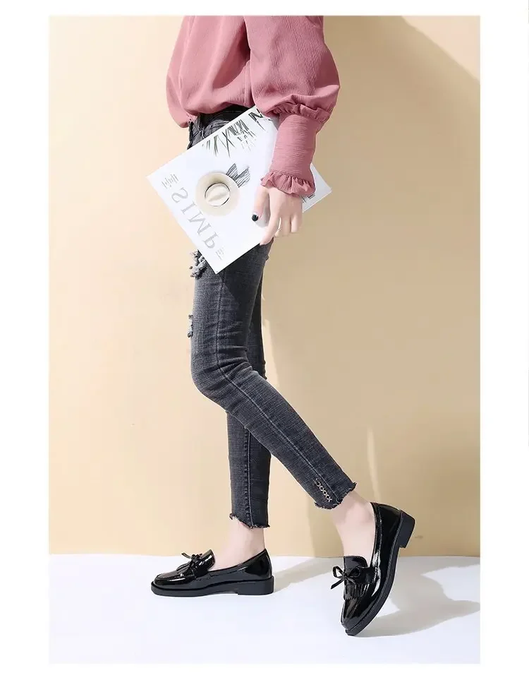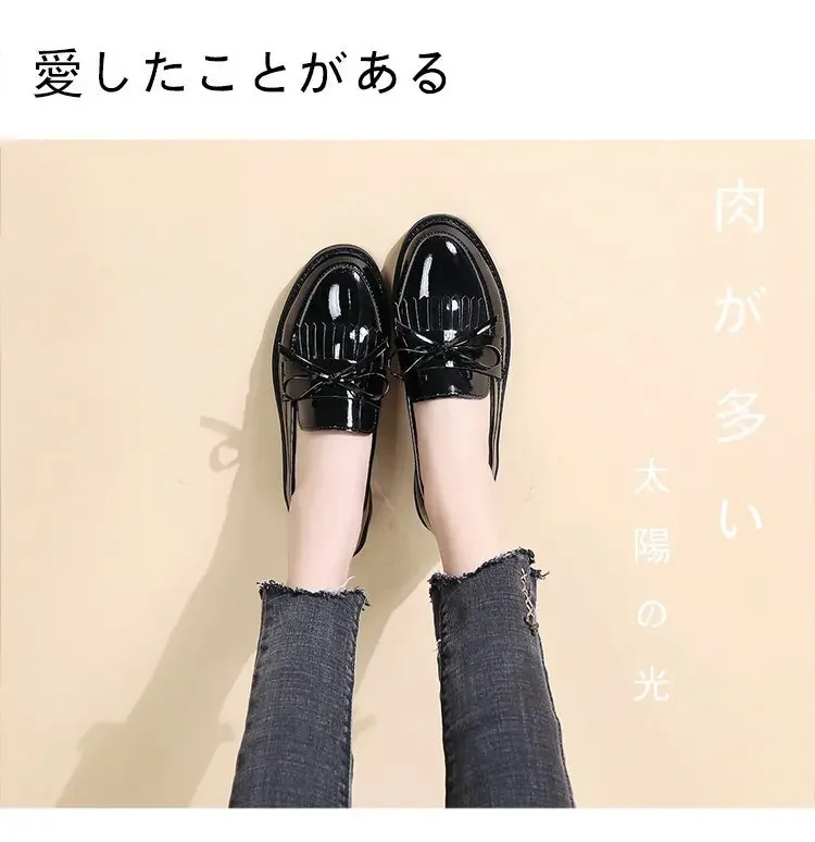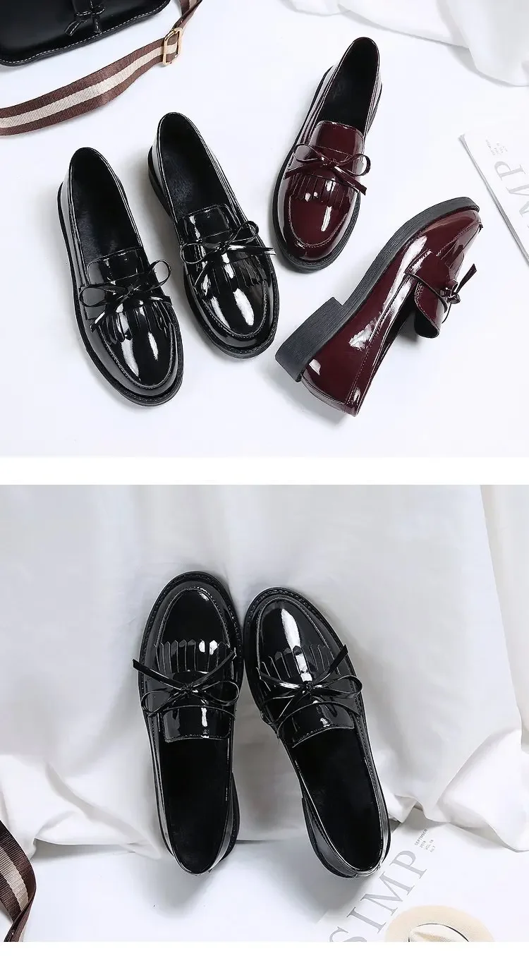 Mocassini da donna in pelle verniciata nera con plateau, scarpe slip on da donna, nuove scarpe basse casual con fiocco e nappa britannica primaverile
