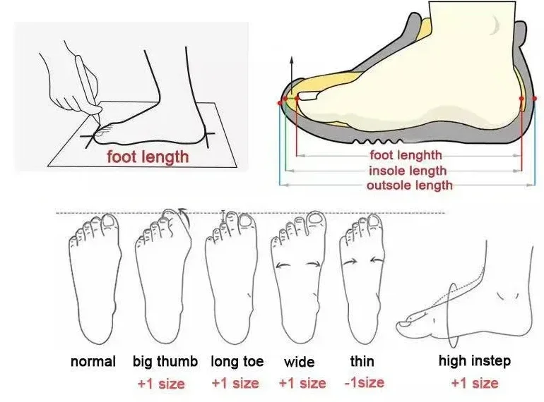 Il numero di taglia qui è completamente diverso dalla tabella delle taglie delle scarpe nel tuo paese, ma la lunghezza del piede nudo non cambierà, quindi deve misurare il piede nudo con una righello, quindi scegli la tabella delle dimensioni ci.