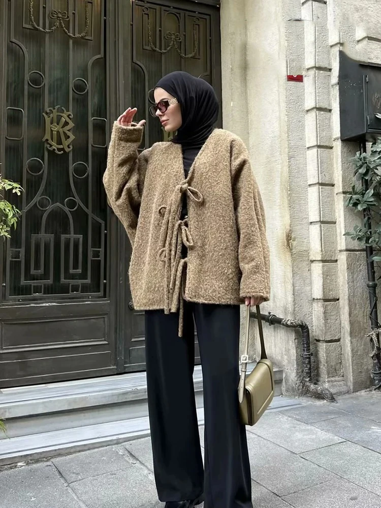 Moda Donna Cardigan a Maglia Casual Autunno e Inverno Allentato Tinta Unita Scollo a V Cravatta Cappotto Retrò Manica Lunga Giacca Pendolare