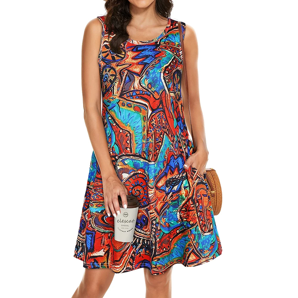 Moda donna casual abito al ginocchio elegante gonna stile bohemien tasche senza maniche semplice versatile abbigliamento femminile estivo