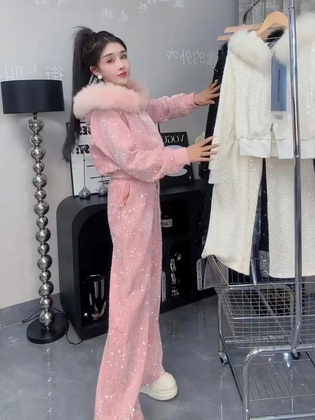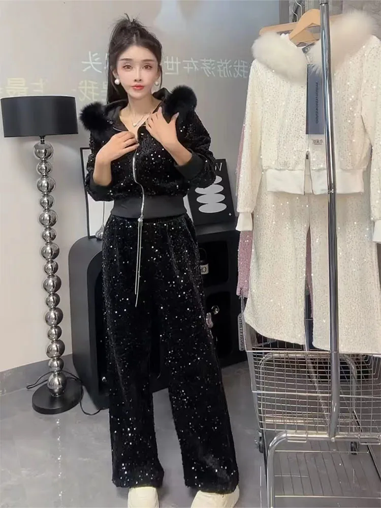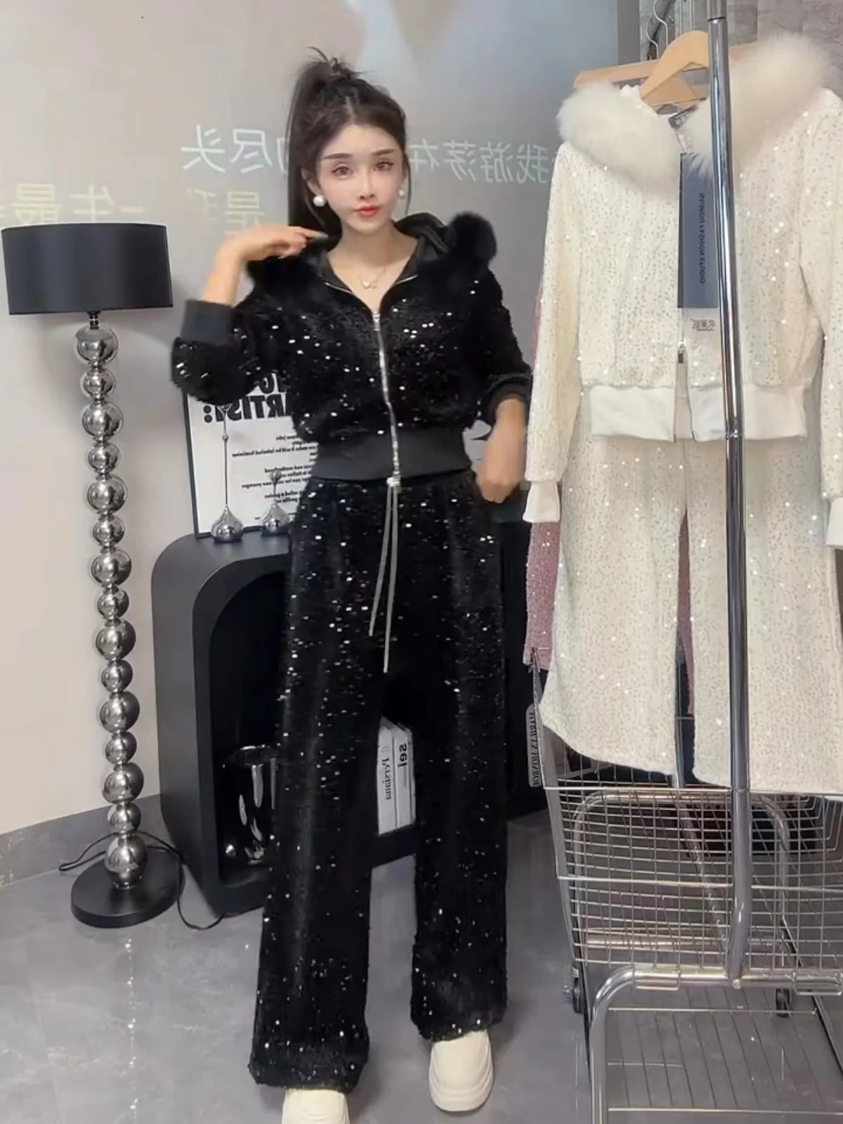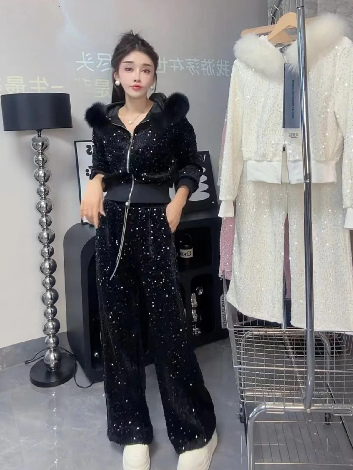 Abito casual con paillettes alla moda Abbigliamento donna 2025 Felpa con collo di pelliccia con cappuccio con paillettes Pantaloni a gamba larga Set da due pezzi da donna