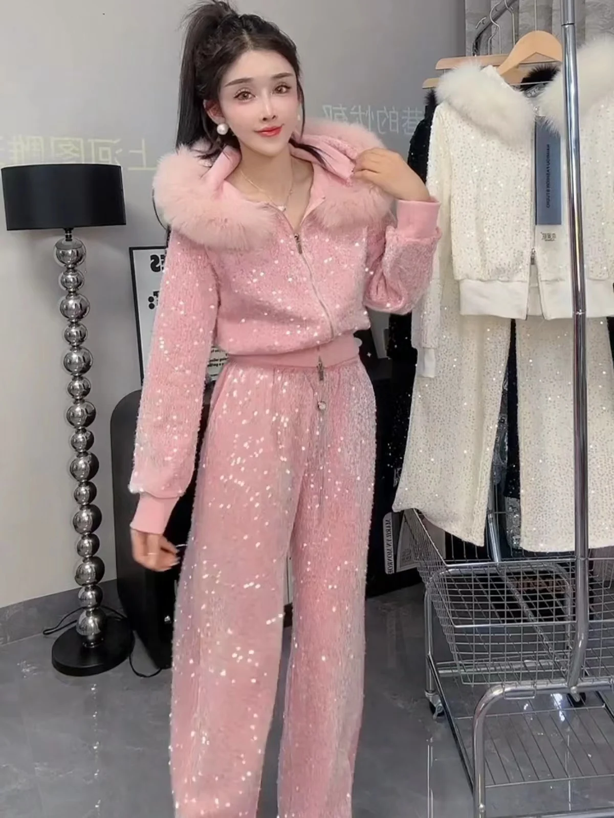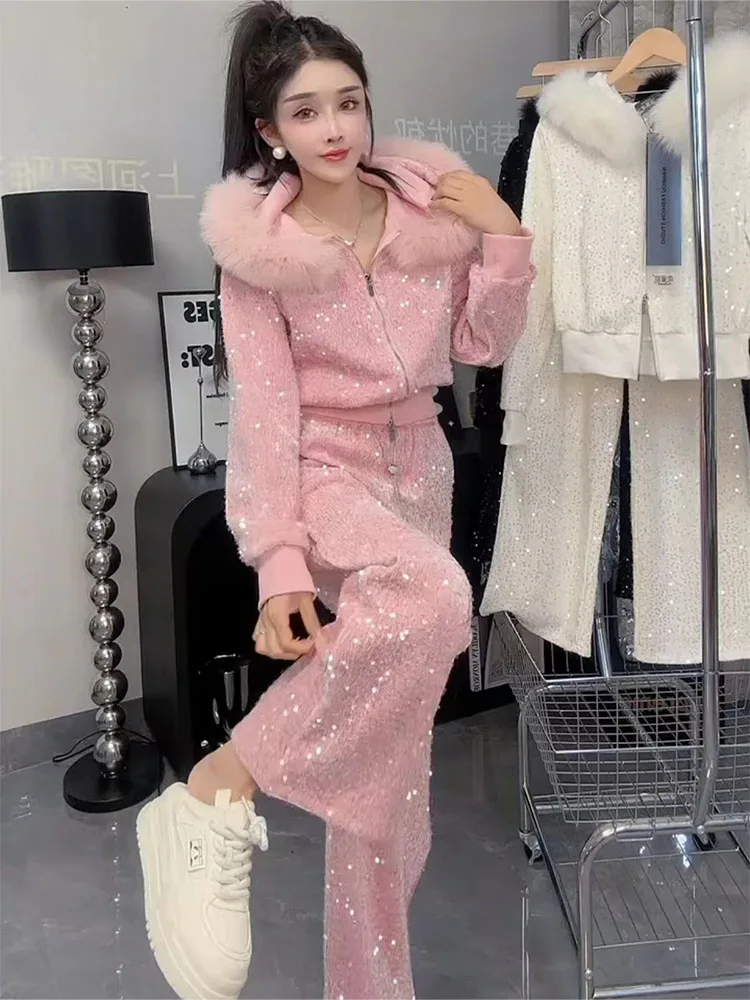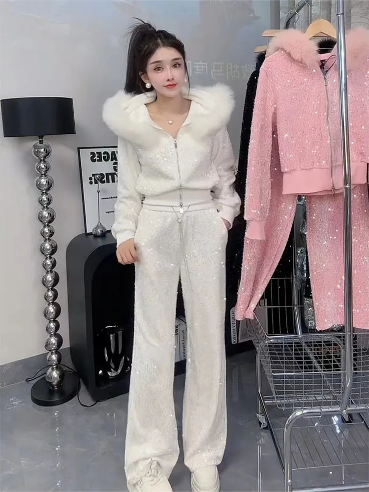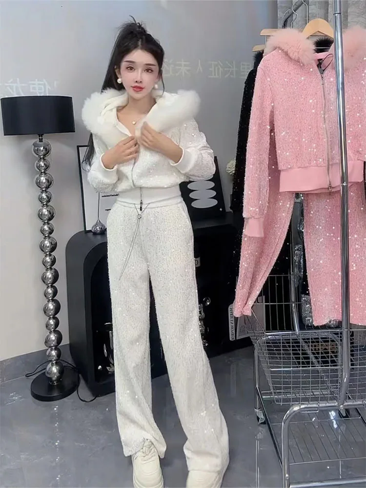 Abito casual con paillettes alla moda Abbigliamento donna 2025 Felpa con collo di pelliccia con cappuccio con paillettes Pantaloni a gamba larga Set da due pezzi da donna