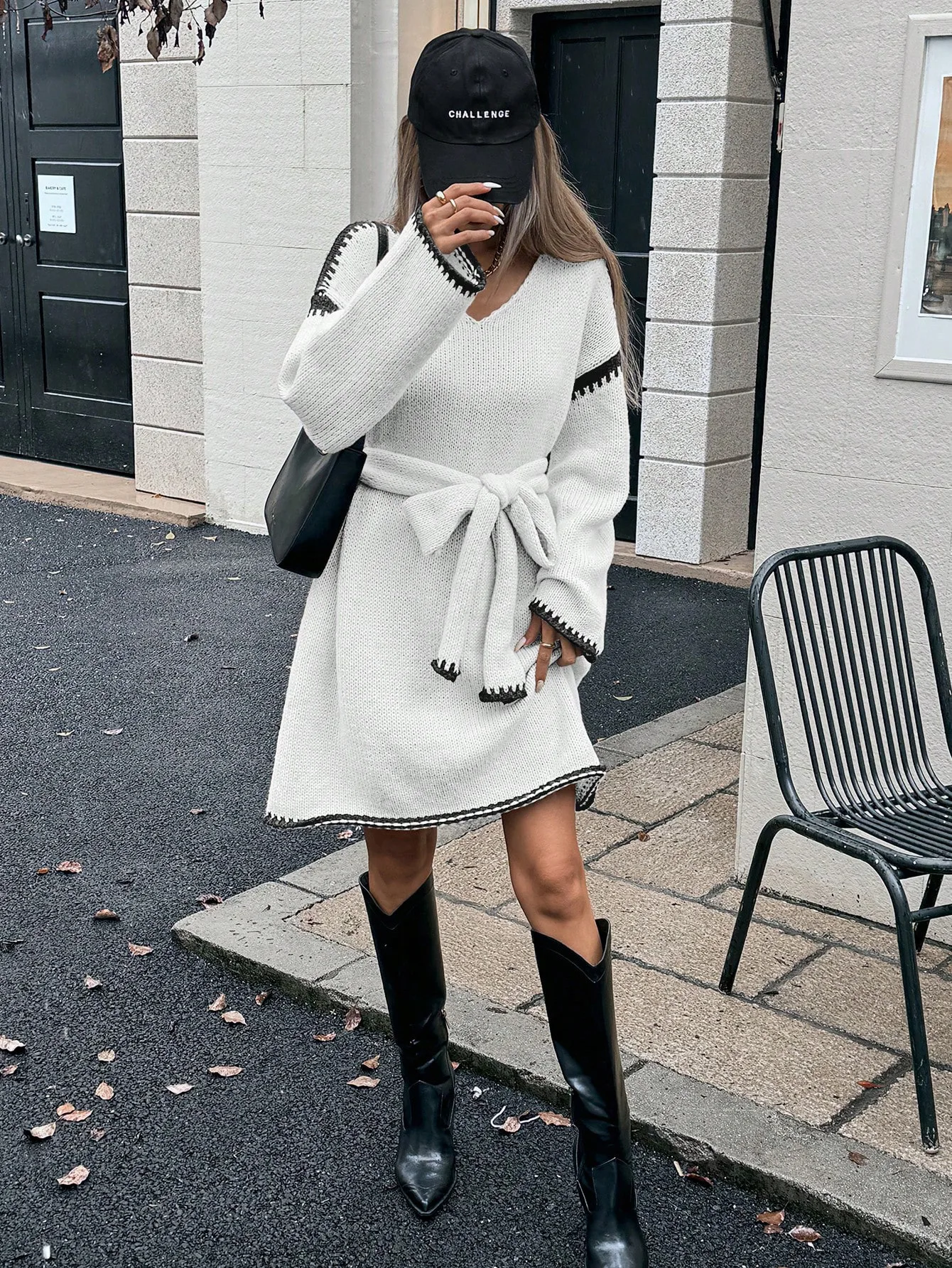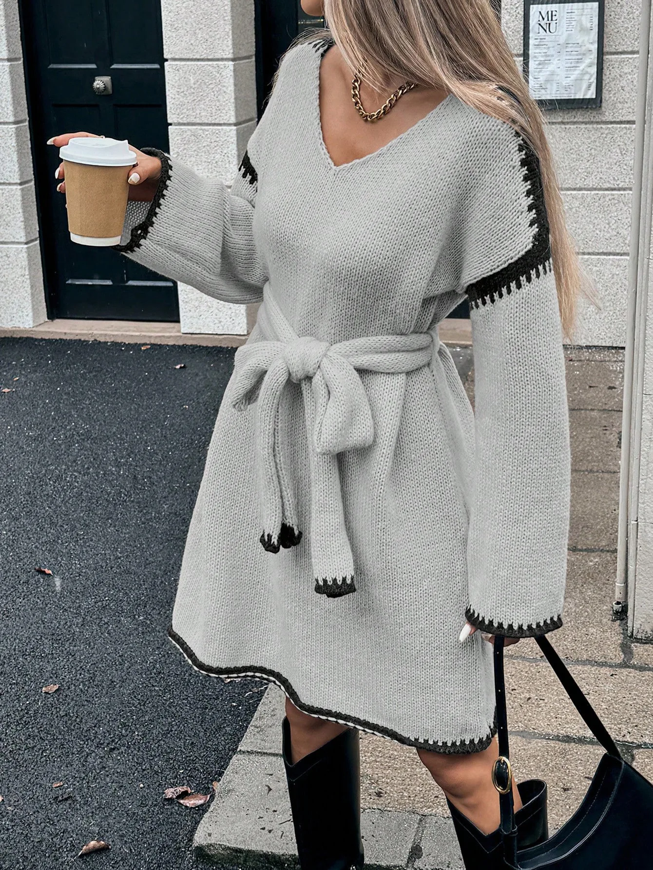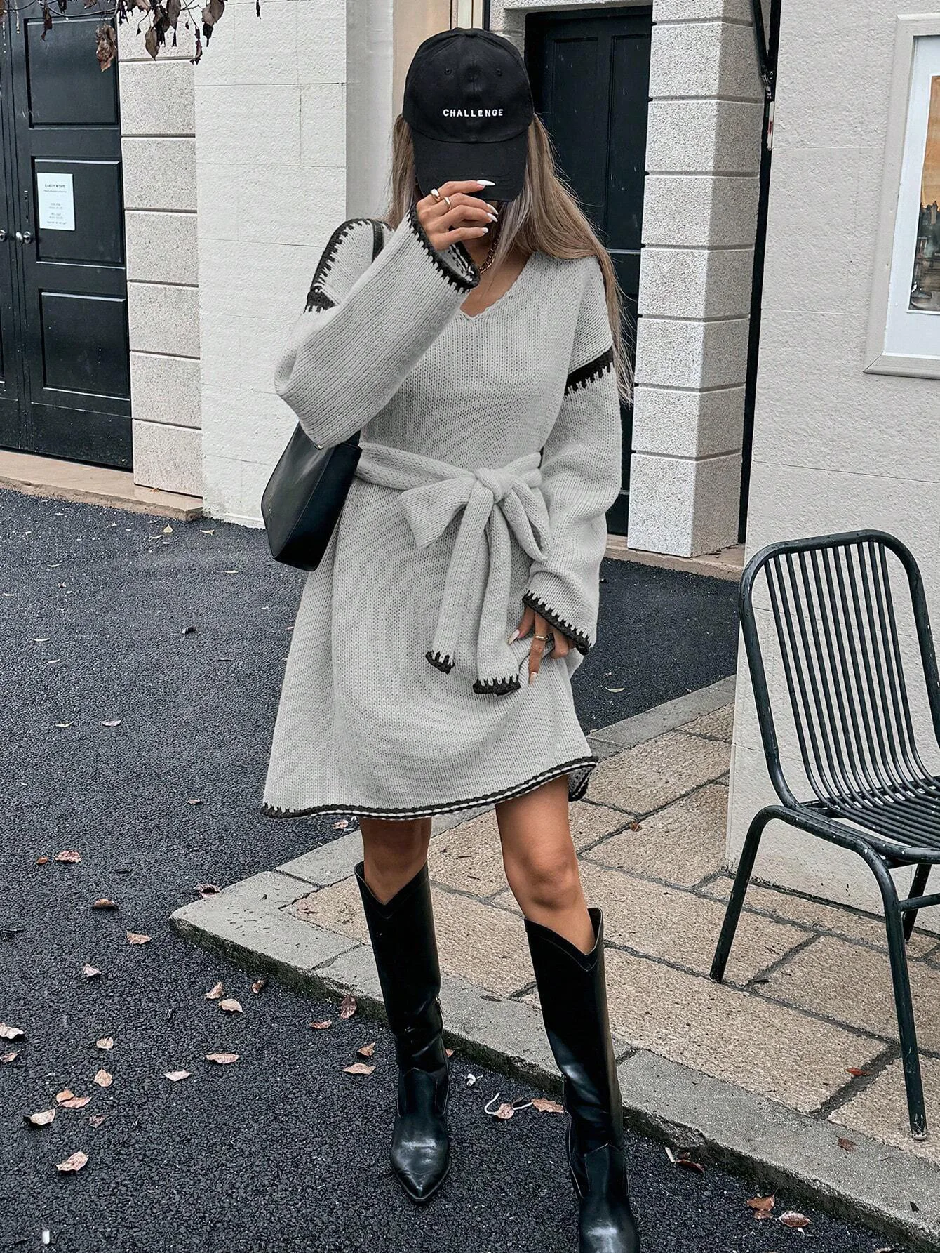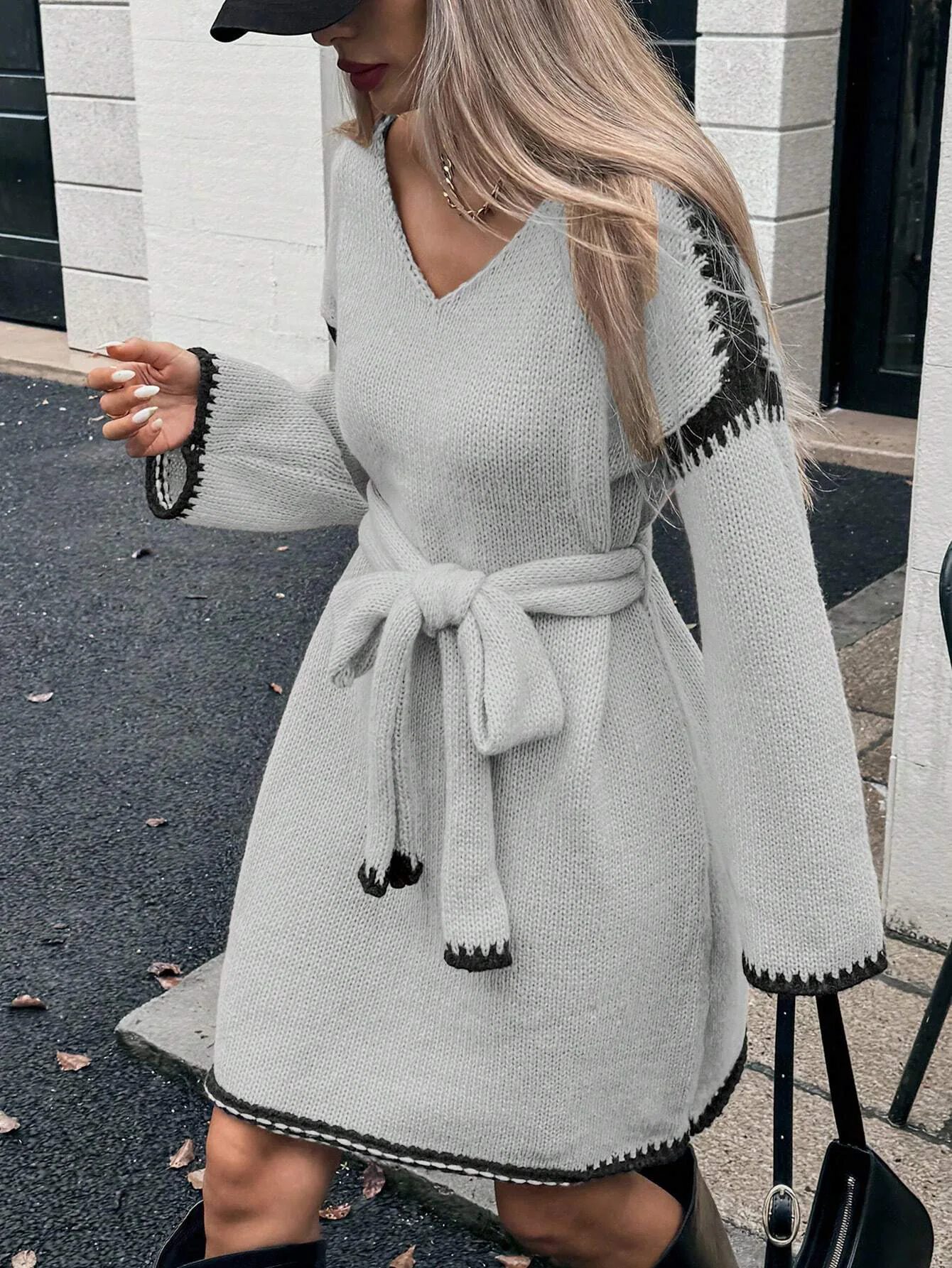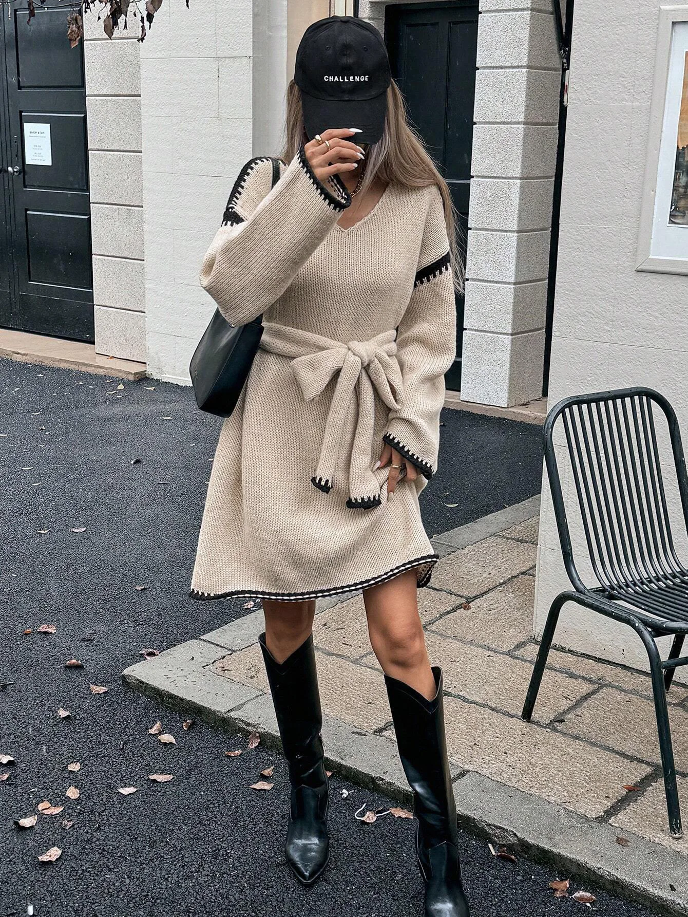 Moda scollo a V manica lunga pullover lavorato a maglia maglioni abito donna elegante cintura capispalla allentato 2025 autunno inverno streetwear