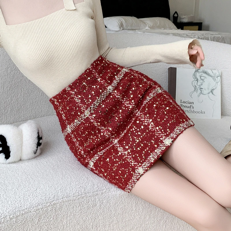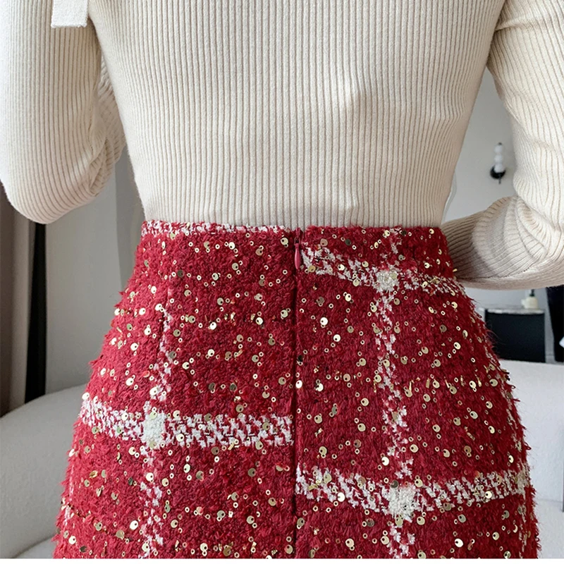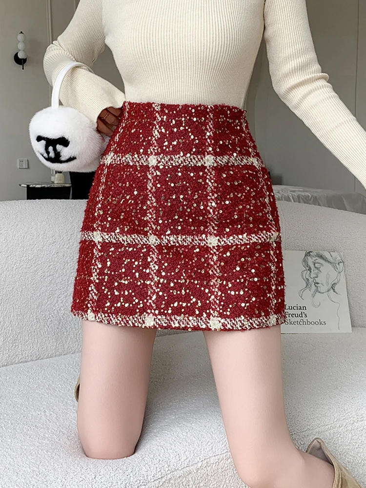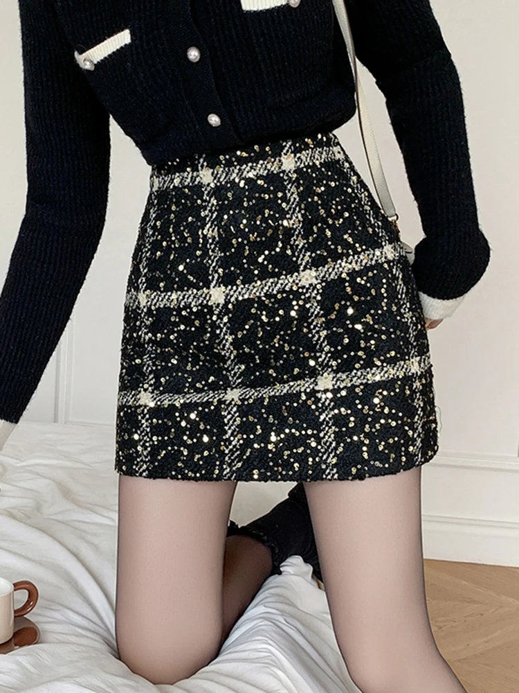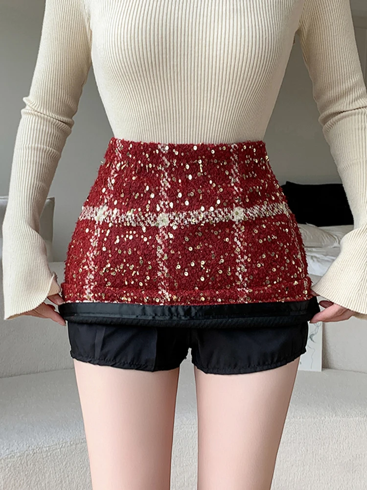 Moda Y2K Inverno Mini Gonne Donna Streetwear Aderente Plaid Gonna con paillettes A-line Kawaii Notte Gonna corta da festa Donna Nero Rosso
