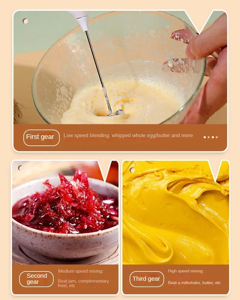2: Sostituzione a doppia testa, veloce ed efficiente, può creare facilmente vari dessert, utilizzata per battere le bianche d’uovo, caffè/bianco d’uovo/crema, burro/glassa, mescolando e mescolare la massa, burro, impacchettatura, produzione di integratori alimentari per bambini, succhi, frappè e altri ingredienti liquidi o semi liquidi.