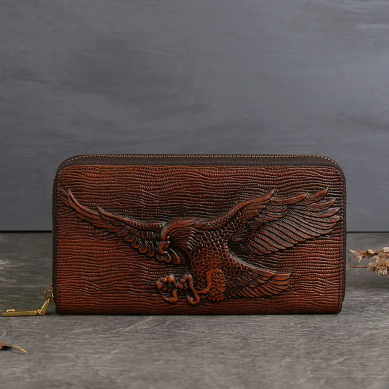 MOTAORA Portafoglio da uomo in vera pelle, porta carte con stampa aquila in pura pelle bovina in rilievo con borsa con manico lungo con cerniera