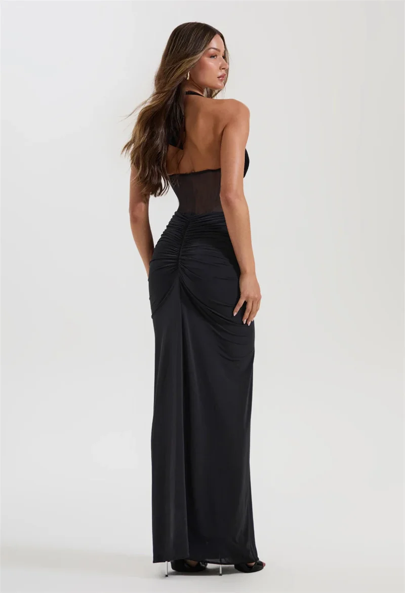 Mozision Halter Backless Sexy Maxi Dress Donna Scollo a V Off-spalla Senza maniche Drappeggiato Increspato Aderente Club Party Abito lungo
