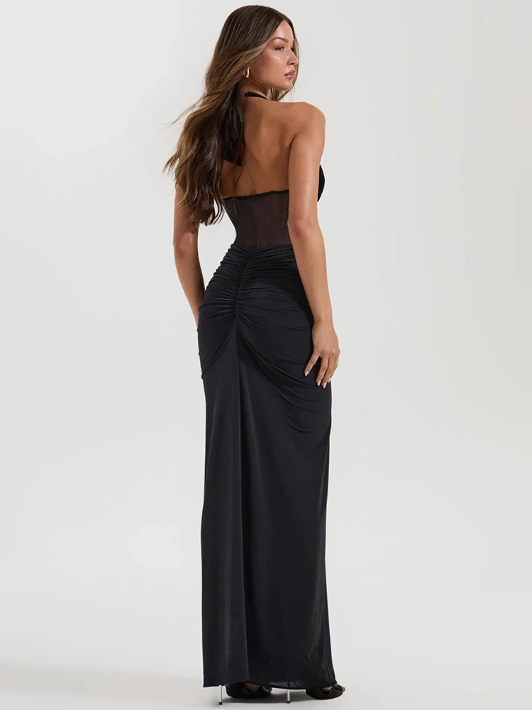 Mozision Halter Backless Sexy Maxi Dress Donna Scollo a V Off-spalla Senza maniche Drappeggiato Increspato Aderente Club Party Abito lungo