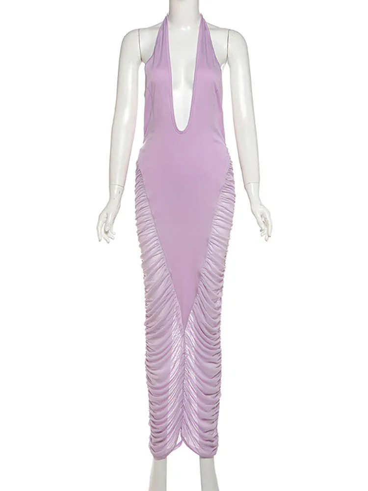 Mozision Halter profondo scollo a V maxi abito sexy abito da donna viola moda patchwork maglia a vita alta increspato club abito lungo femminile