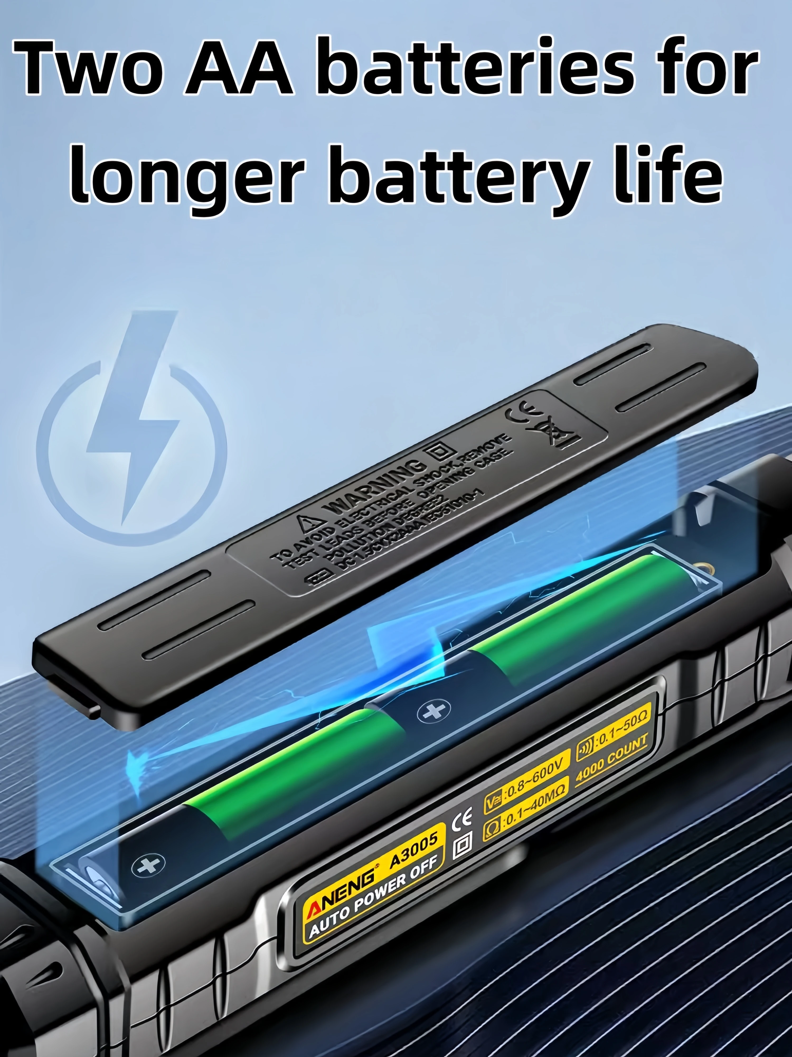 Gestione intelligente della batteria: Supporta la funzione di conservazione dei dati per bloccare i risultati della misurazione senza scomparsa; si spegne automaticamente dopo 15 minuti di inattività.Due batterie AAA possono essere utilizzate continuamente per oltre 100 ore e lo schermo avviserà in tempo reale quando la tensione è bassa.