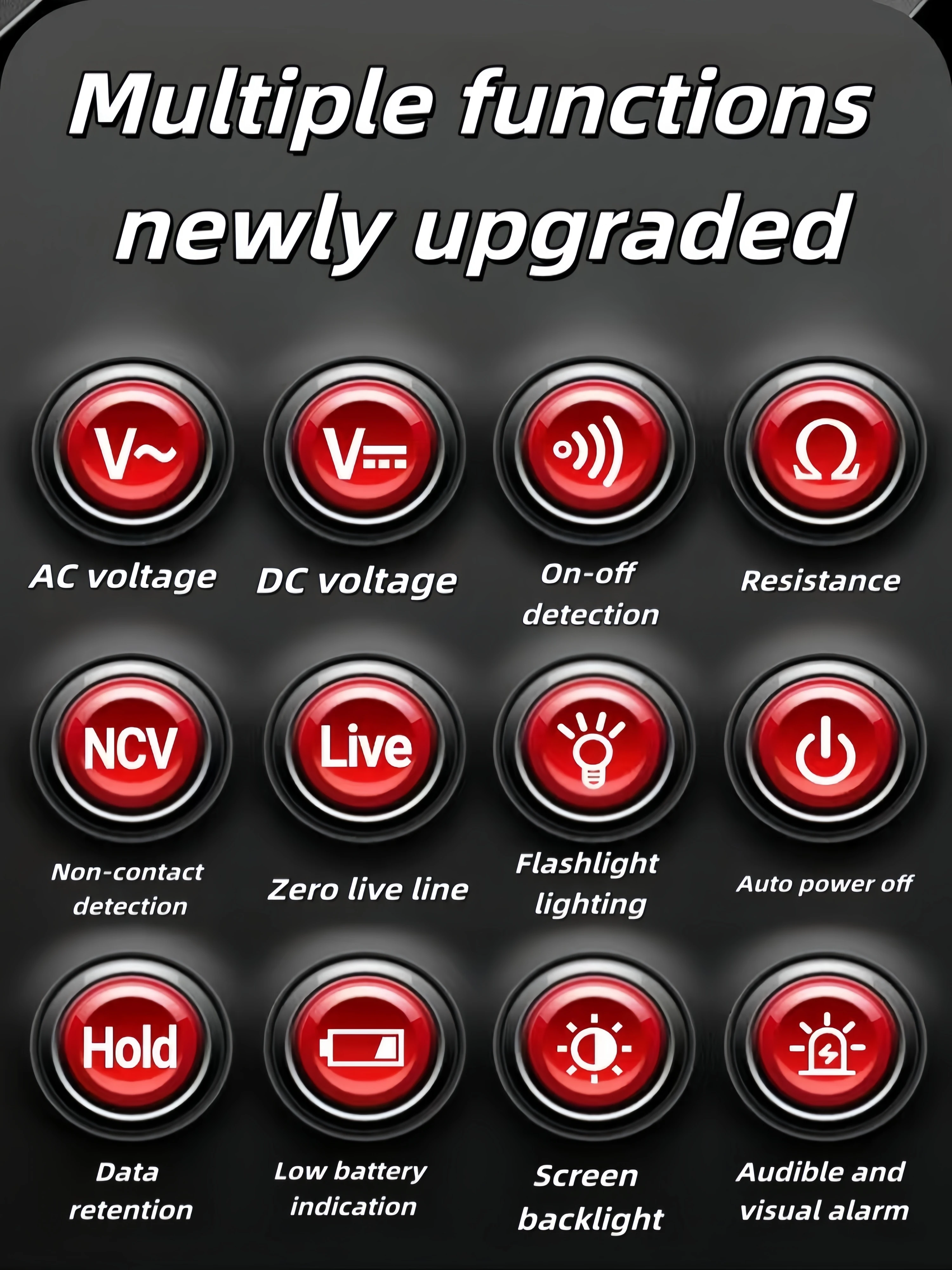 Doppi allarmi sonori e luminosi: Quando la misurazione supera l’intervallo o tocca il cavo sotto tensione, il cicalino suona immediatamente e lo schermo lampeggia per richiesta.Puoi identificare rapidamente i pericoli anche in ambienti poco illuminati.