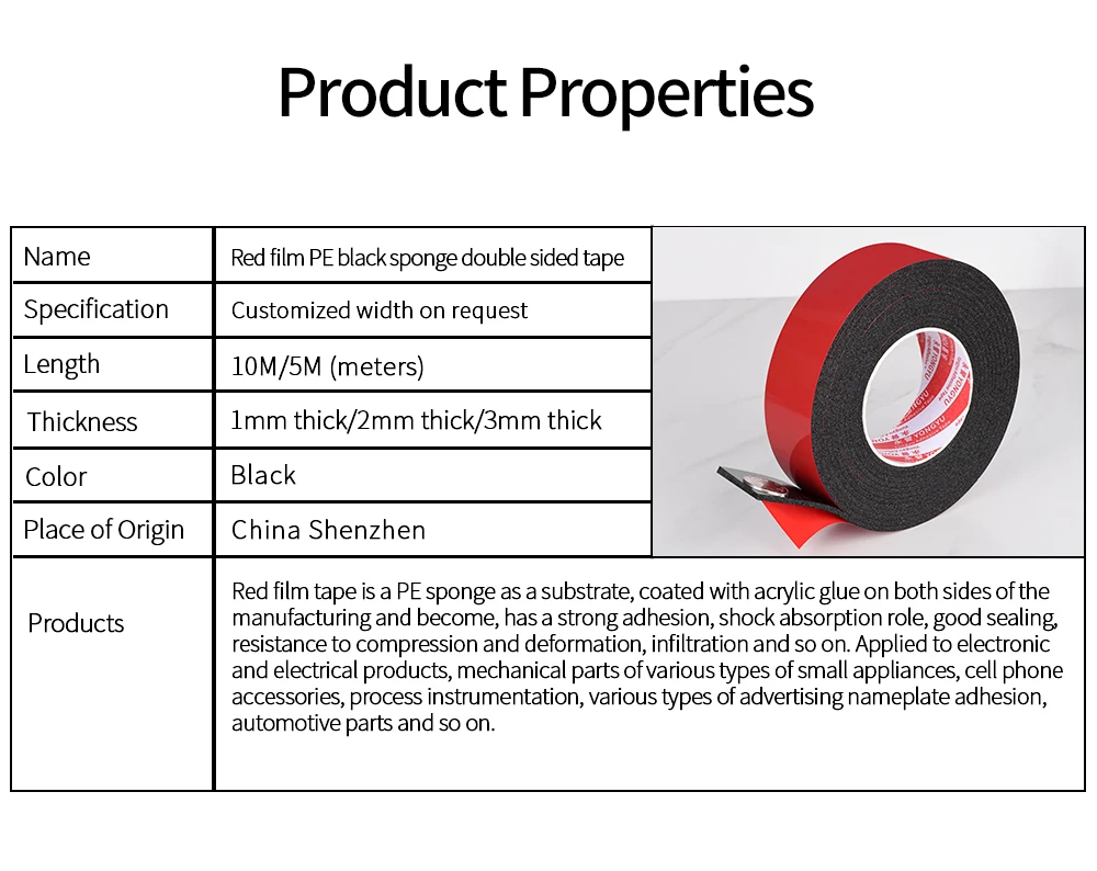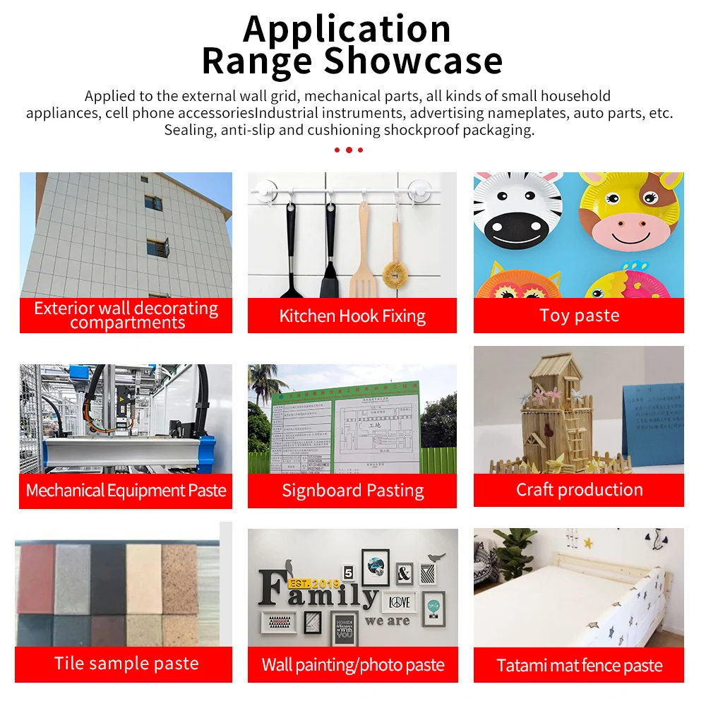 È adatto per incollare e fissare la striscia decorativa del telaio fotografico, la striscia decorativa per mobili, la striscia decorativa per automobili, lavagna ondulata, l’arco ruota, il deflettore, la lampada freno, il logo dell’automobile, il cartello del motociclo, la targhetta elettrica, la striscia di lana e così viaHa le seguenti caratteristiche: forte adesione, buona ritenzione, protezione UV, resistenza al calore, resistenza all’acqua, solubilità e resistenza alla plastica.Resistenza alla temperatura: 80~120 C.