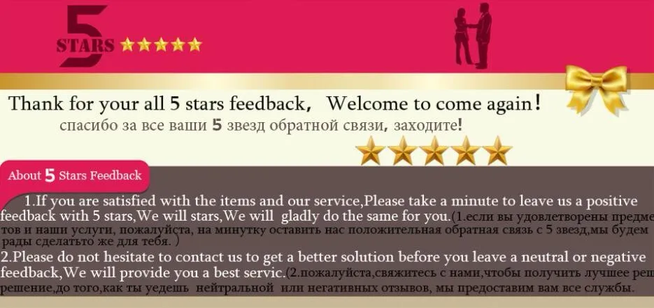 Quando hai ricevuto il pacco e ti è piaciuto, conferma gentilmente l’ordine ricevuto e lasciaci un feedback positivo con stelle piene. Se hai domande, ti preghiamo di contattarci prima di lasciare un feedback negativo, promettiamo di risolvere tutti i problemi per te, grazie!