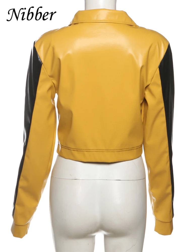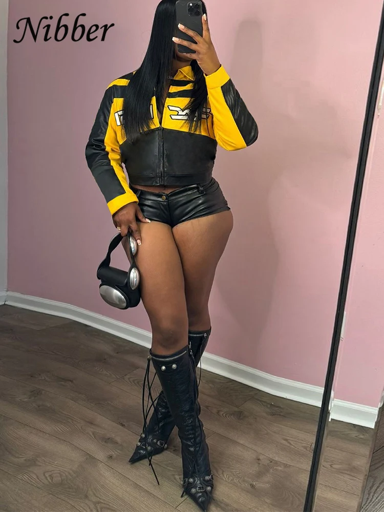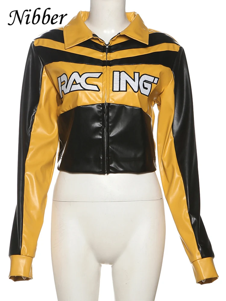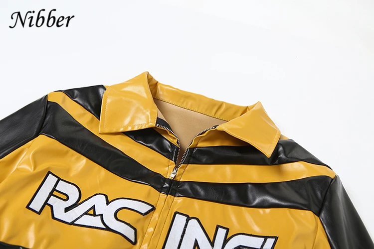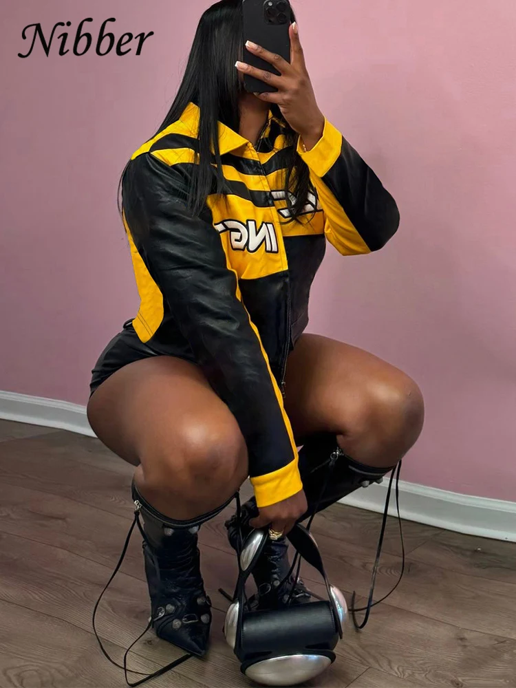 Nibber Patchwork Giacca corta in ecopelle Donna Lettera Ricamo Risvolto Zip Manica intera Tendenza autunnale Cool Streetwear Cappotto a vita bassa