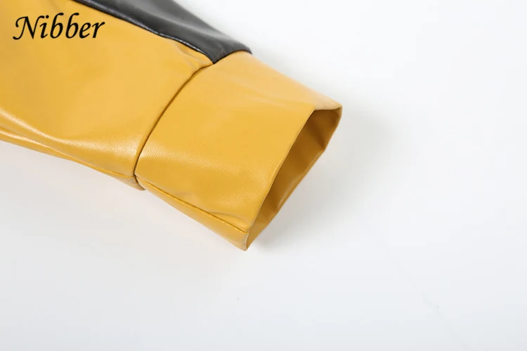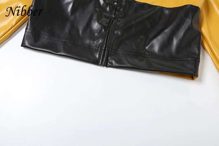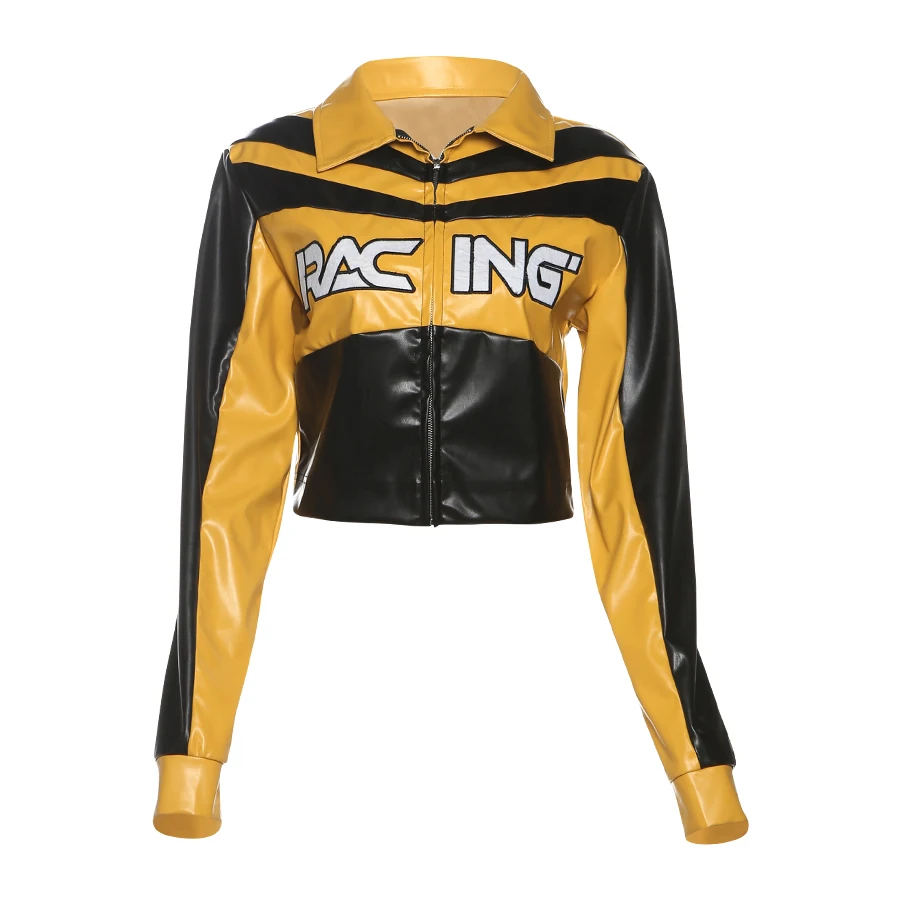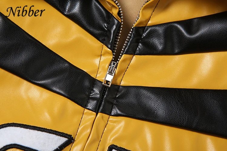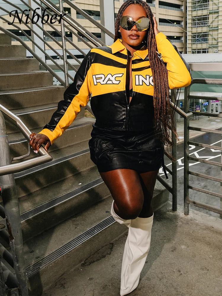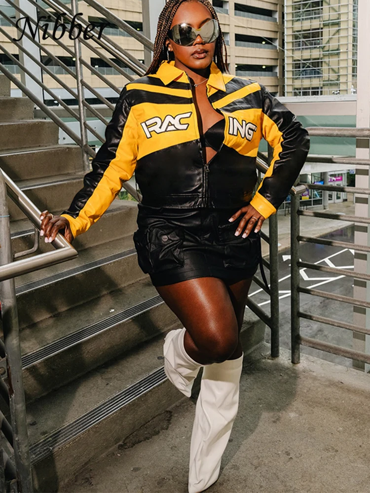 Nibber Patchwork Giacca corta in ecopelle Donna Lettera Ricamo Risvolto Zip Manica intera Tendenza autunnale Cool Streetwear Cappotto a vita bassa