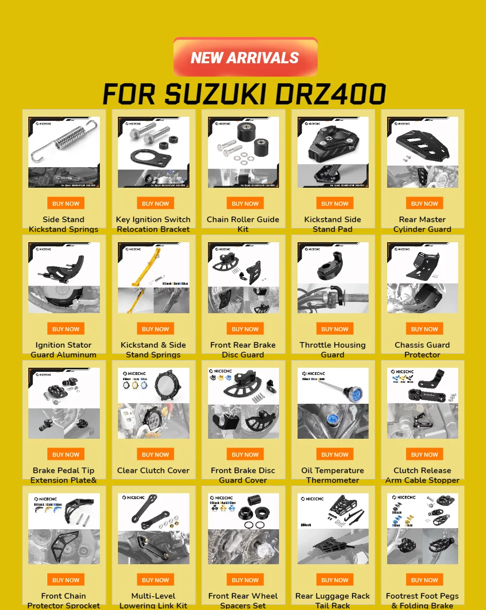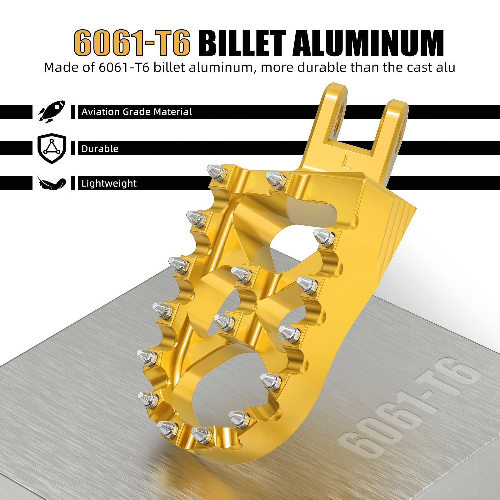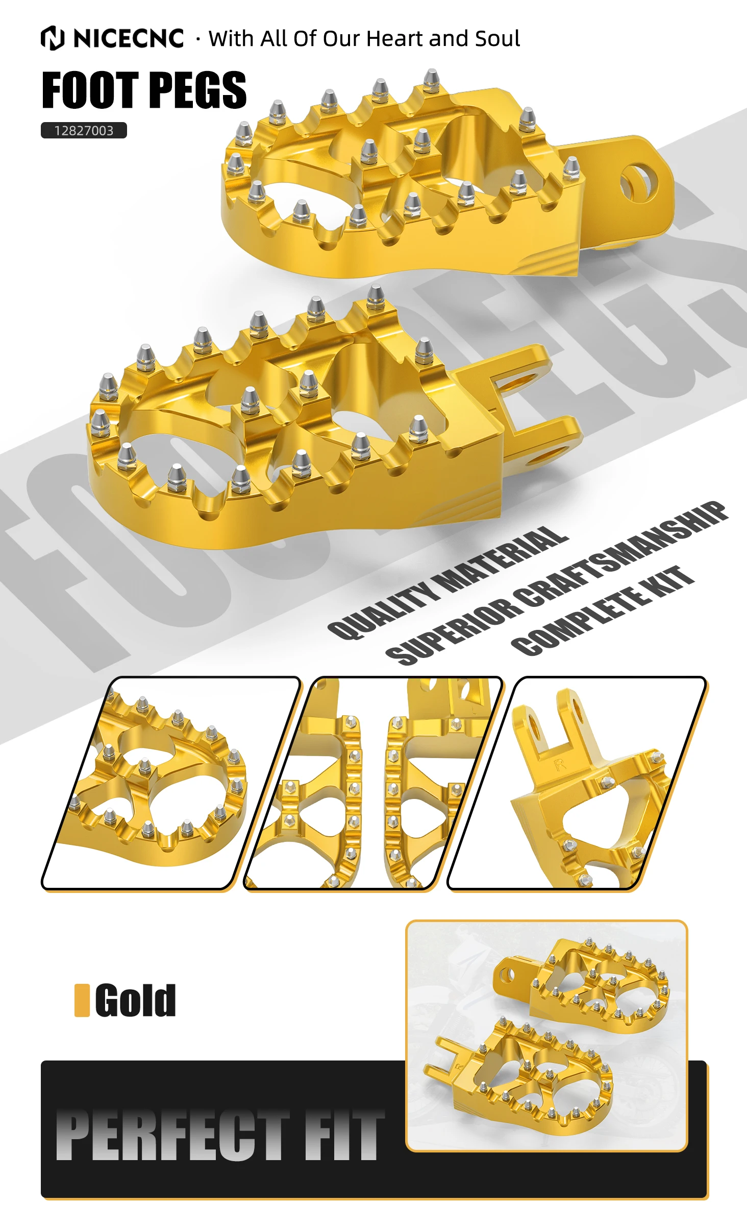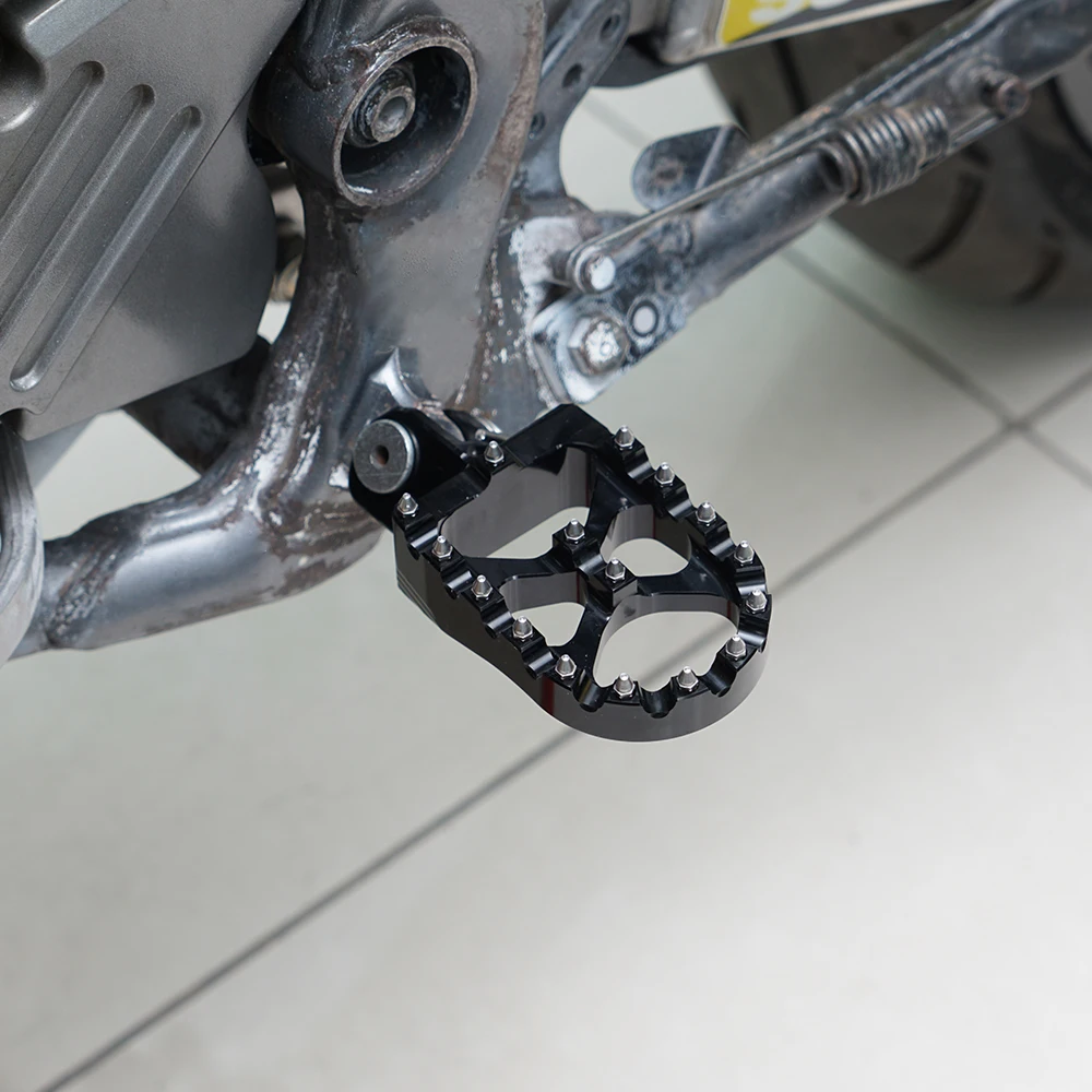 — CNC-machined from billet aluminum– Anodized surface finishing parts give your bike an eye-catching look– Upgraded 57mm wide platform allows a better accessibility and stability– Stainless steel sharp teeth provide rider with ultimate grip and better anti slip control– 5 extra detachable & wear-resistant stainless steel sharp teeth for your replacement– Easy to install, mount with your OEM springs and pinsItem Specifics:– Condition: 100% Brand New– Material: Aluminum– Processing: CNC-Machined– Color: Black, Gold, BluePackage Included:1x Pair Foot PegsFitment:For Suzuki DRZ400S/SM 2000-2024