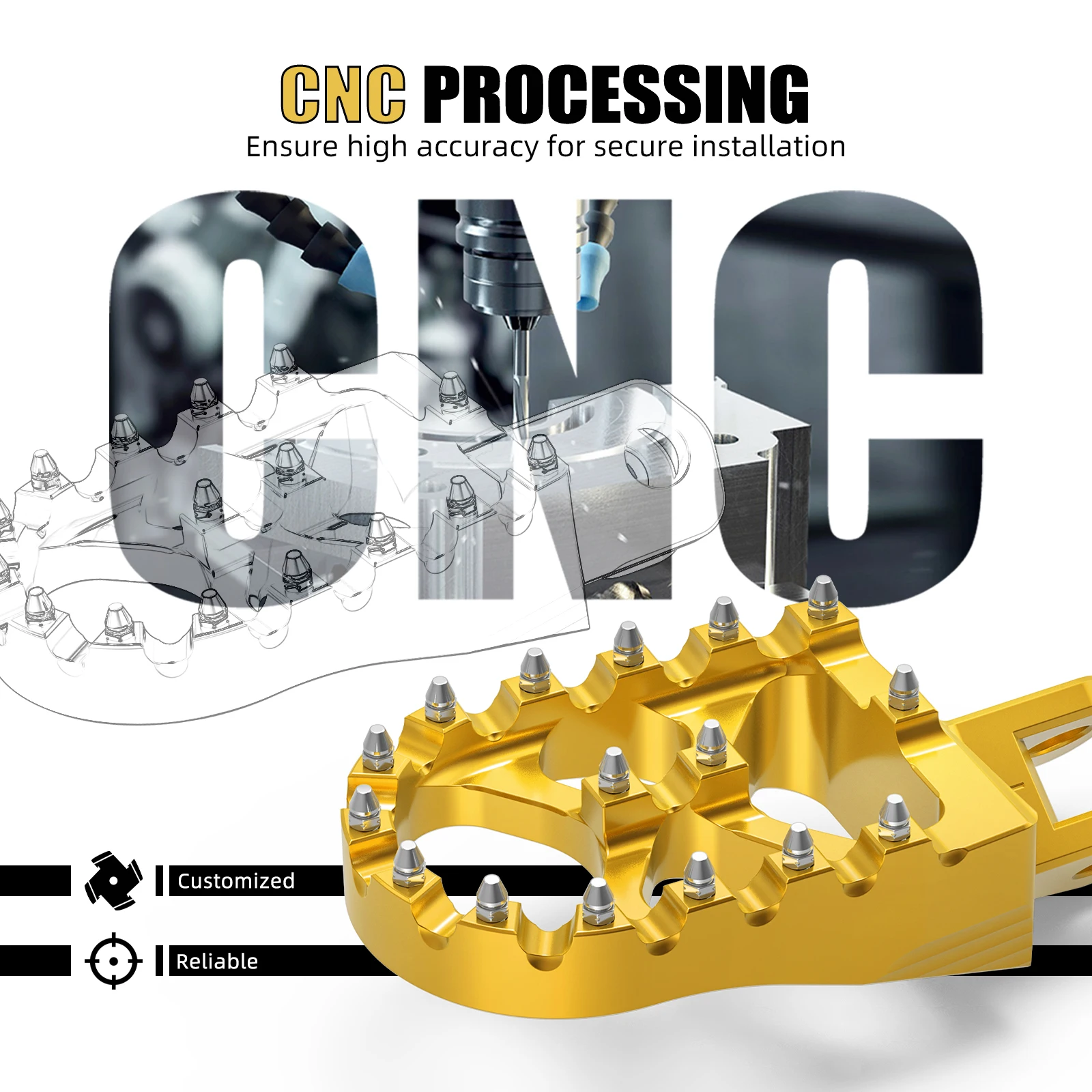 — CNC-machined from billet aluminum– Anodized surface finishing parts give your bike an eye-catching look– Upgraded 57mm wide platform allows a better accessibility and stability– Stainless steel sharp teeth provide rider with ultimate grip and better anti slip control– 5 extra detachable & wear-resistant stainless steel sharp teeth for your replacement– Easy to install, mount with your OEM springs and pinsItem Specifics:– Condition: 100% Brand New– Material: Aluminum– Processing: CNC-Machined– Color: Black, Gold, BluePackage Included:1x Pair Foot PegsFitment:For Suzuki DRZ400S/SM 2000-2024