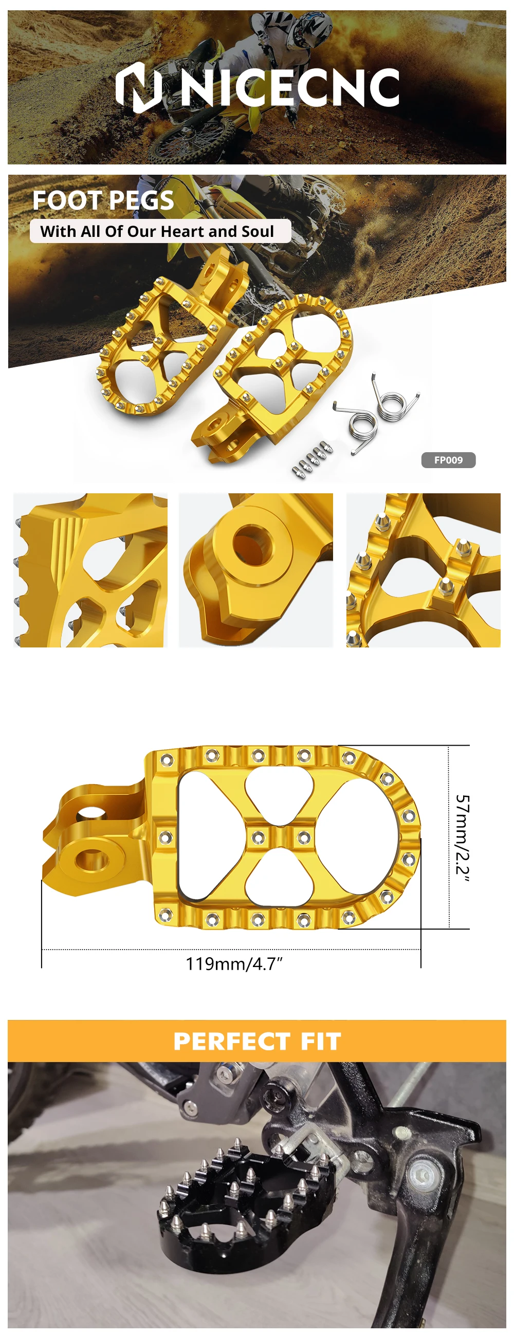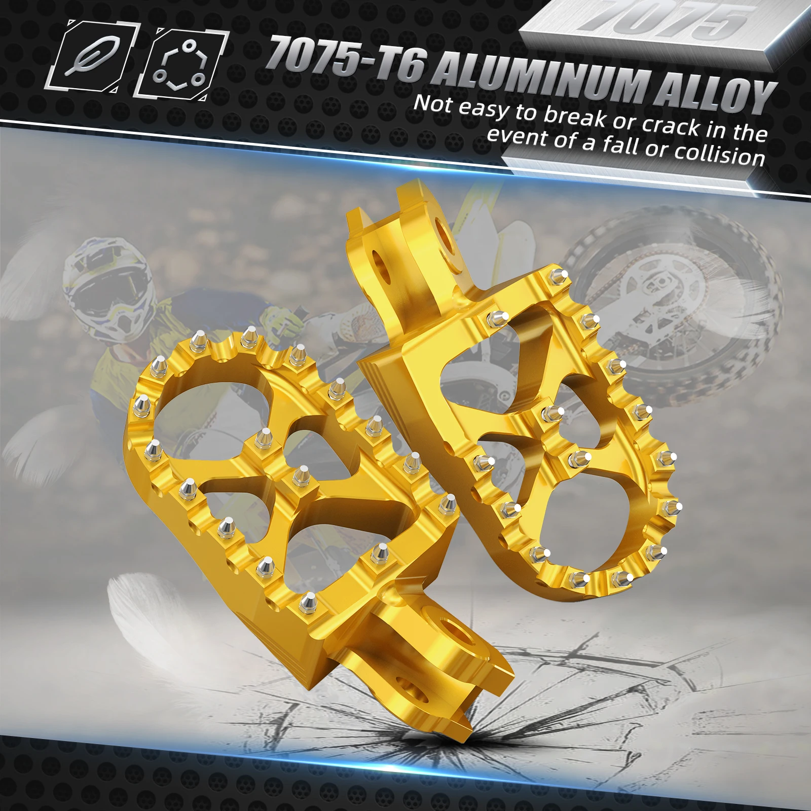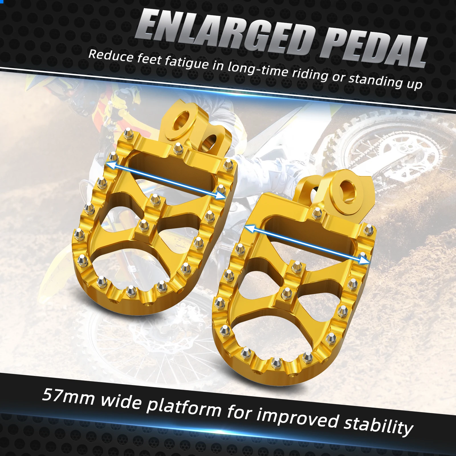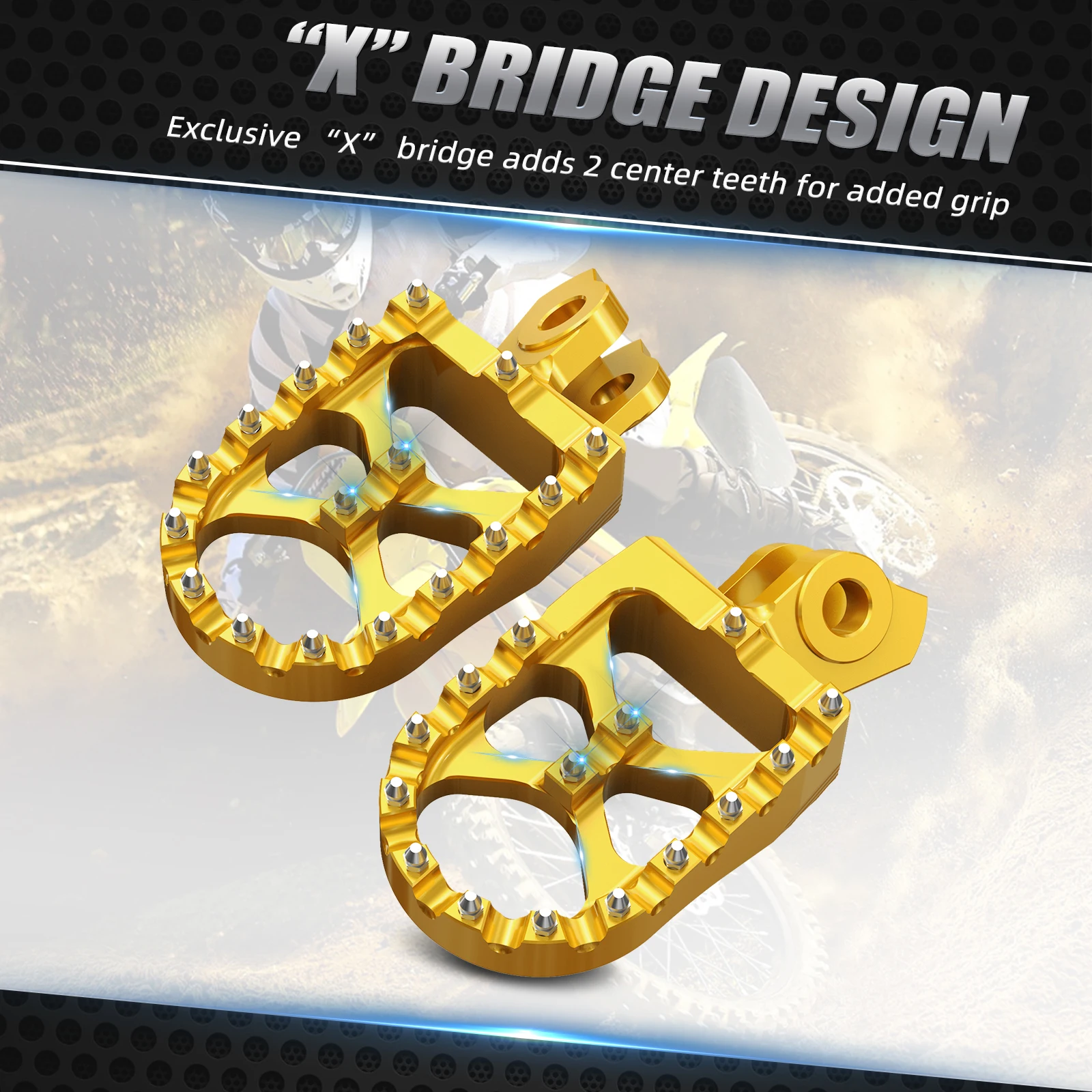 — Condizione: 100% nuovo di zecca — Materiale: lega di alluminio 7075-T6 — Elaborazione: lavorata a CNC — Superficie: anodizzazione — Colore: oro, nero — Denti piatti in acciaio inox — Completamente lavorato a CNC in alluminio billet 7075-T6 di qualità aeronautica — Finitura superficiale anodizzata — Piattaforma larga 57 mm per una migliore stabilità — L’esclusivo ponte "X" aggiunge 2 denti centrali per una maggiore presa — Fornito con 5 denti di ricambio in acciaio inossidabile — Facile da installare, monta con tutto l’hardware di serie Il pacchetto include: 1x paio di poggiapiedi in billette largo 57 mm