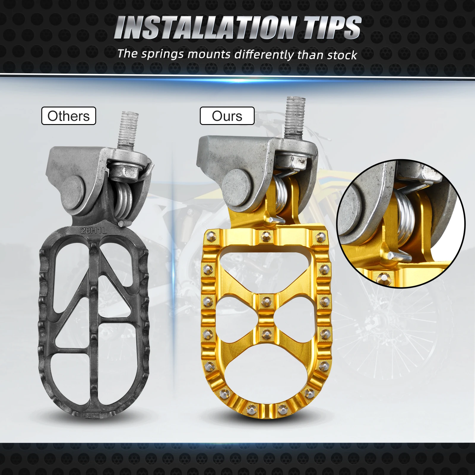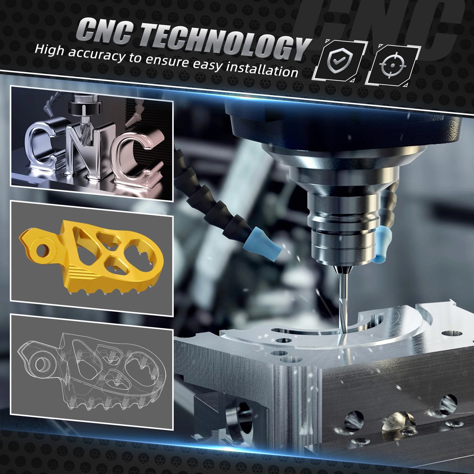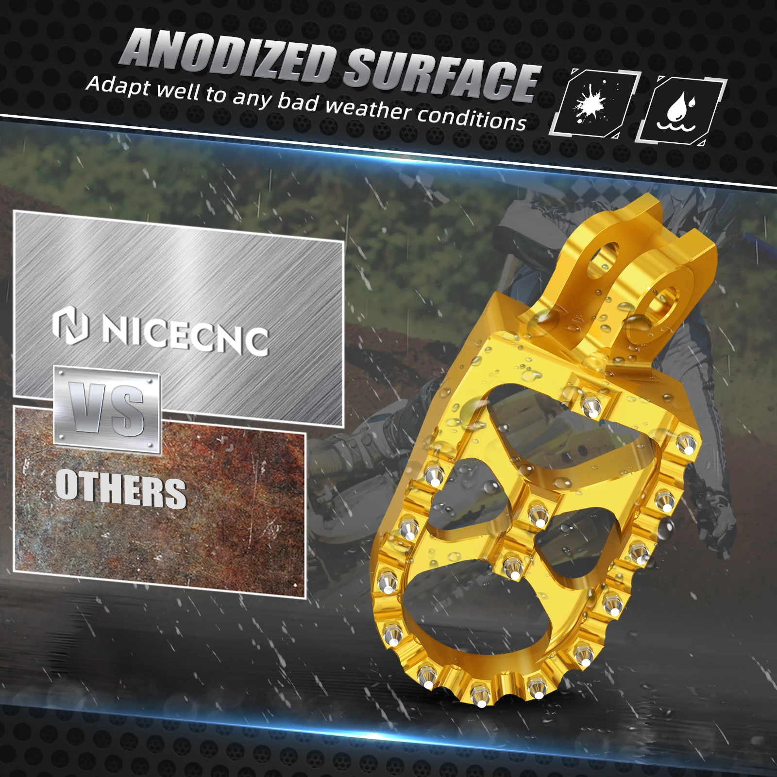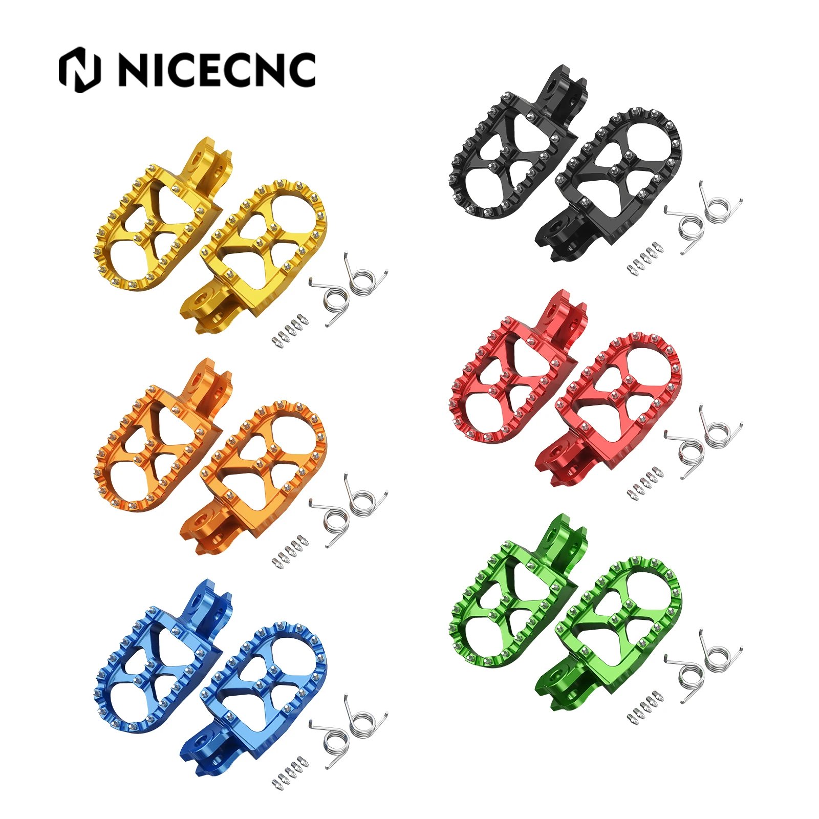 — Condizione: 100% nuovo di zecca — Materiale: lega di alluminio 7075-T6 — Elaborazione: lavorata a CNC — Superficie: anodizzazione — Colore: oro, nero — Denti piatti in acciaio inox — Completamente lavorato a CNC in alluminio billet 7075-T6 di qualità aeronautica — Finitura superficiale anodizzata — Piattaforma larga 57 mm per una migliore stabilità — L’esclusivo ponte "X" aggiunge 2 denti centrali per una maggiore presa — Fornito con 5 denti di ricambio in acciaio inossidabile — Facile da installare, monta con tutto l’hardware di serie Il pacchetto include: 1x paio di poggiapiedi in billette largo 57 mm