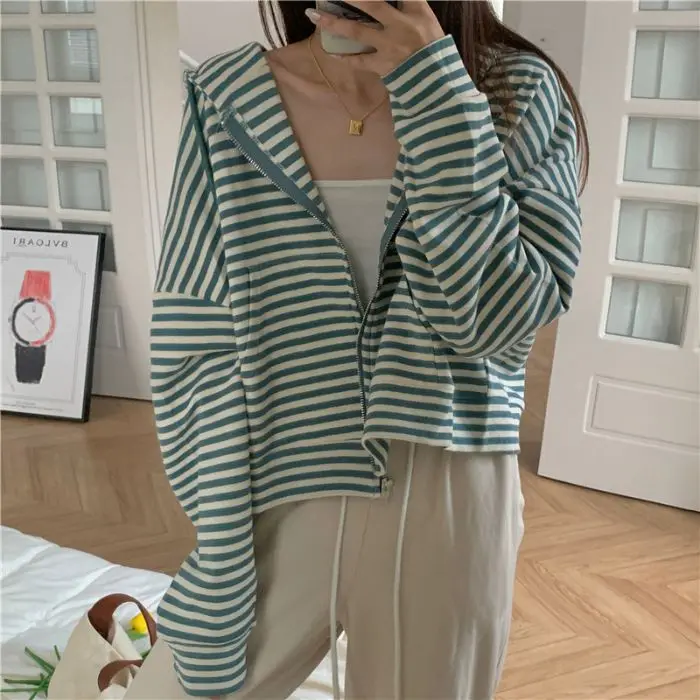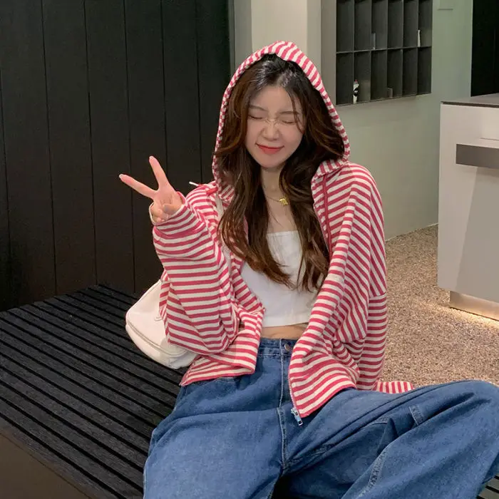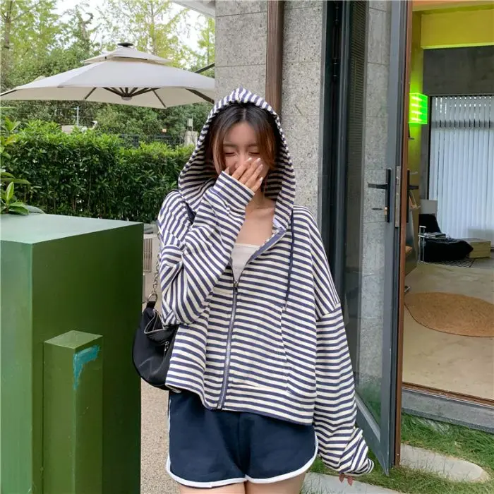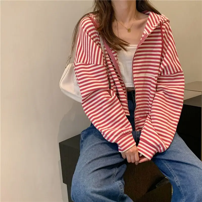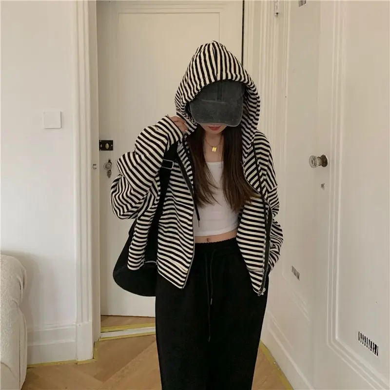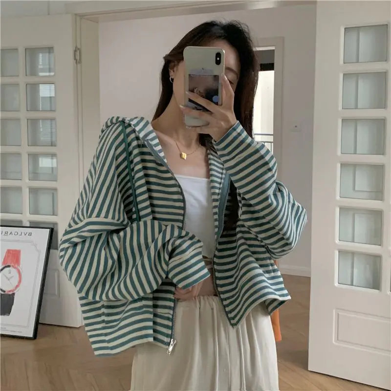 Nuova giacca da strada alta con cerniera sottile a righe primavera autunno manica lunga allentata moda giovanile top corti abbigliamento casual coreano da donna