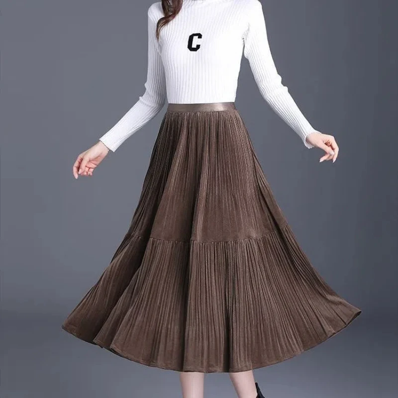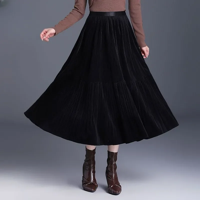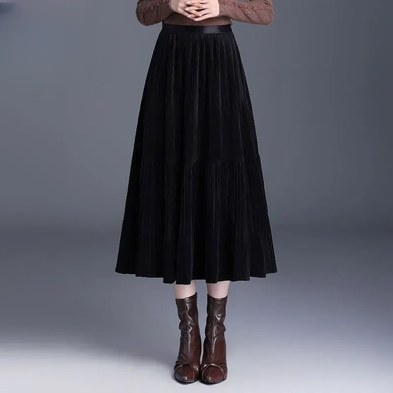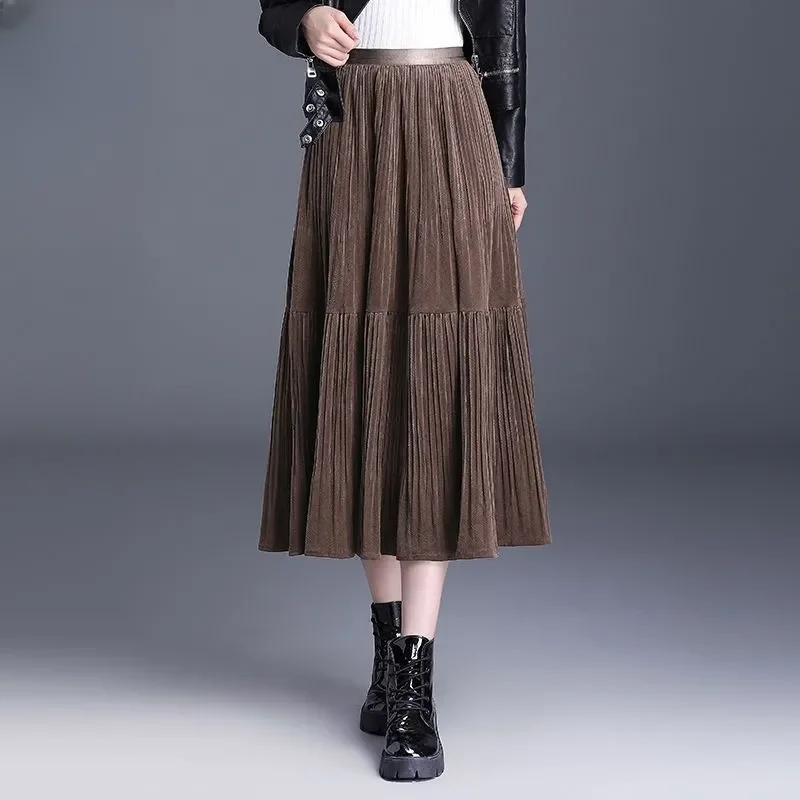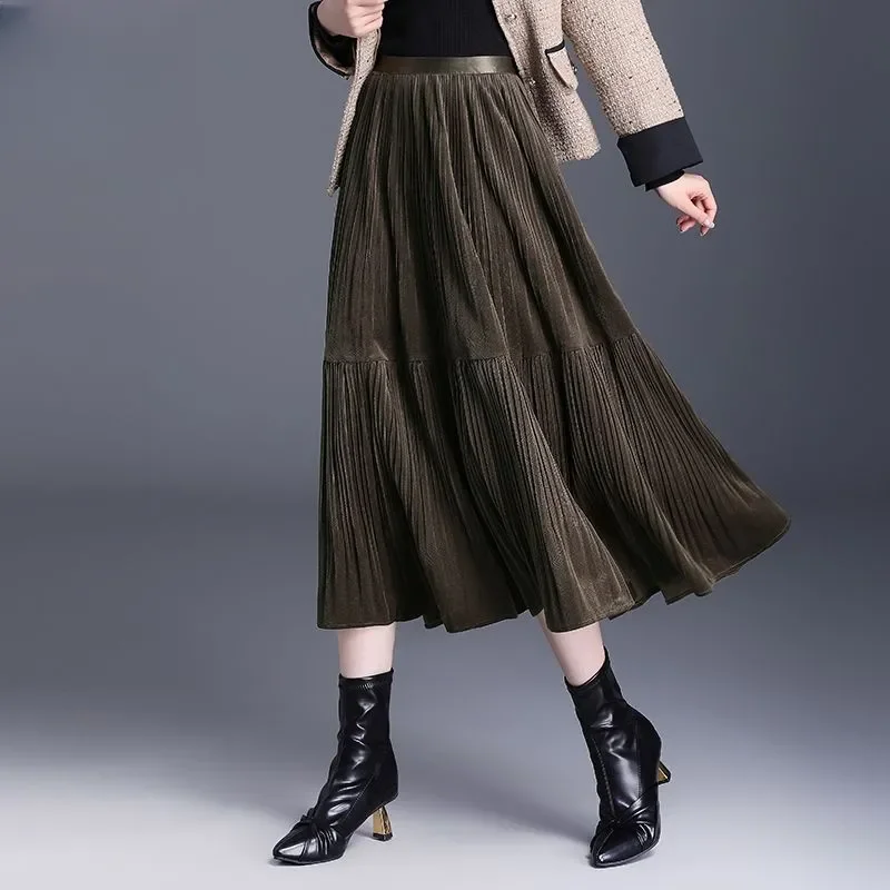 Nuova gonna a pieghe in velluto dorato autunno e inverno Gonna slim elastica e alla moda a vita alta di media lunghezza
