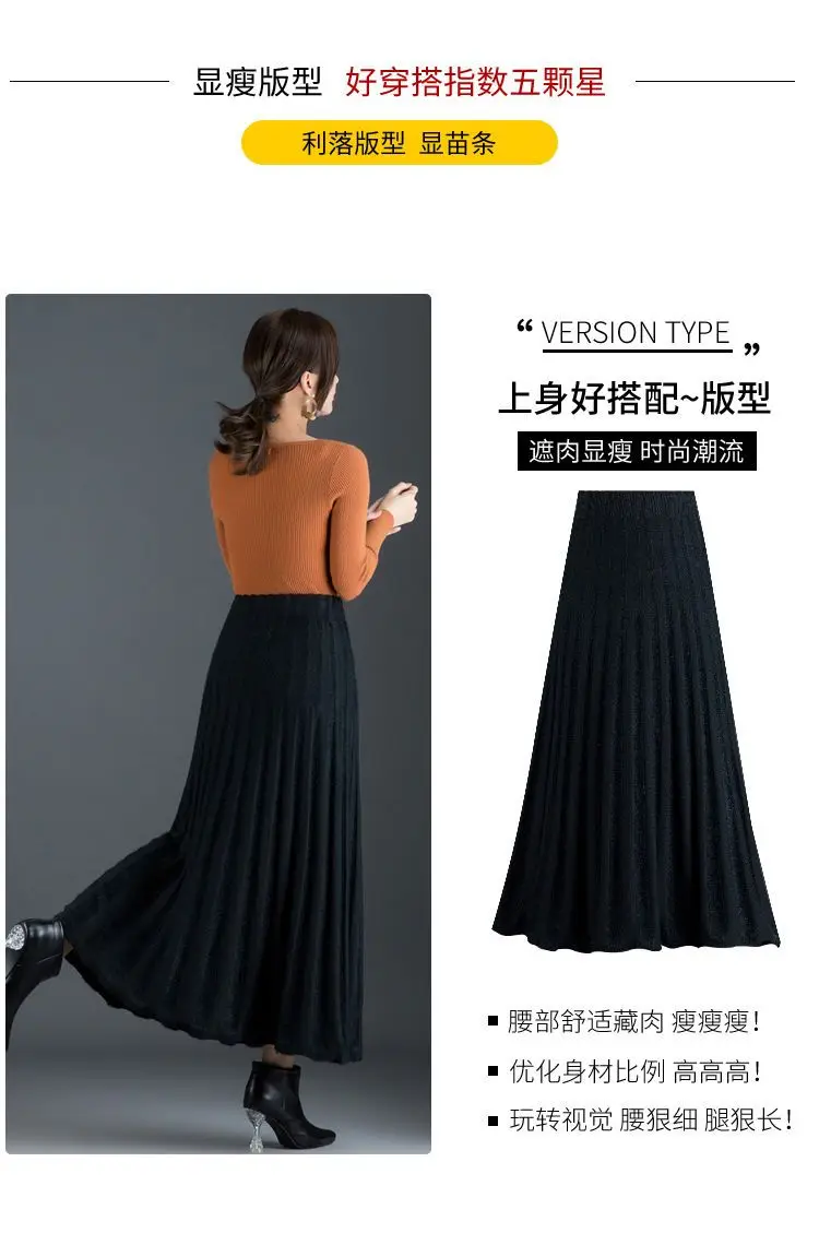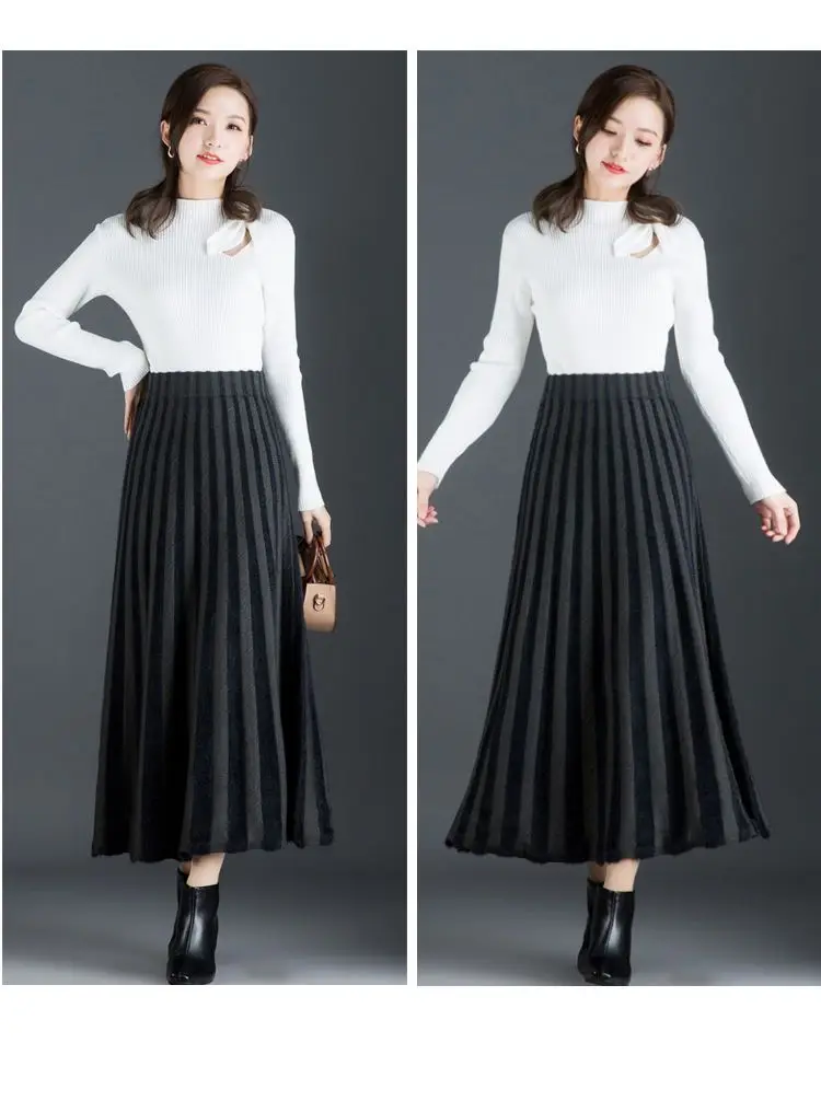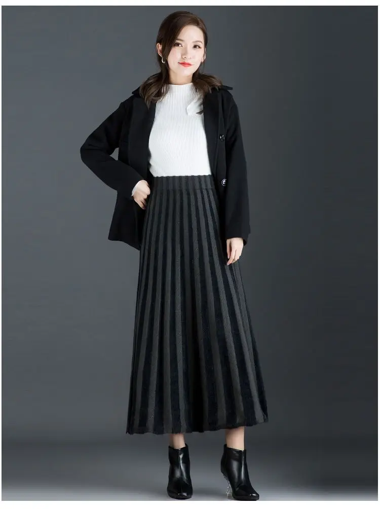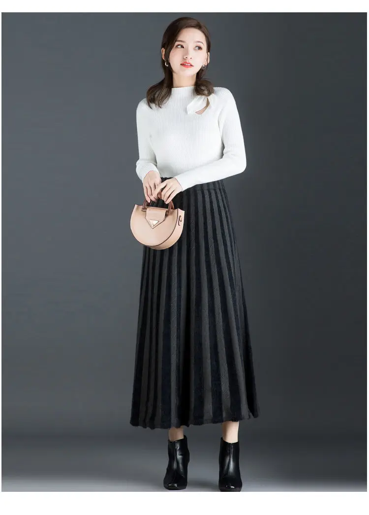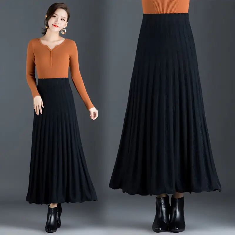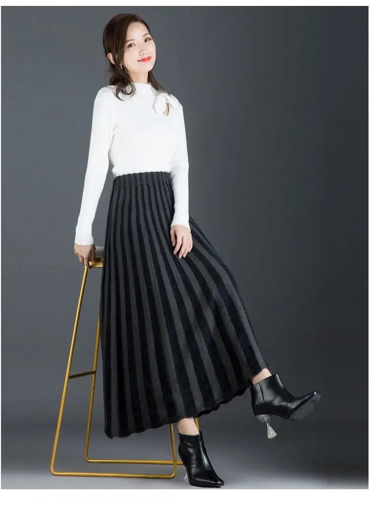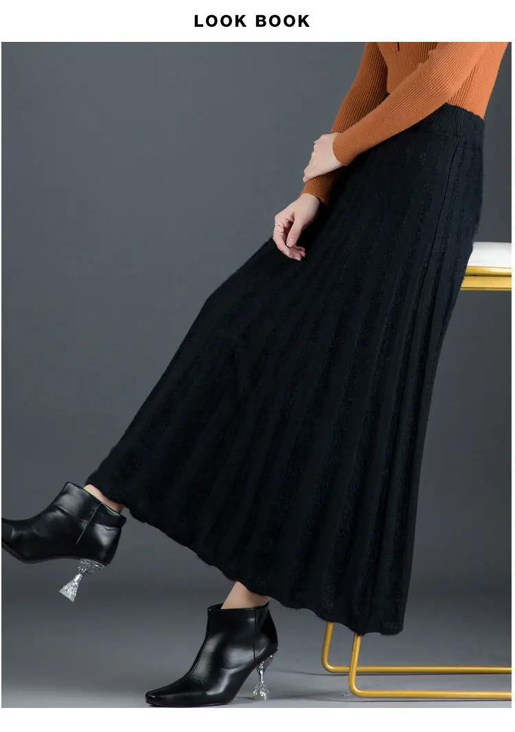 Nuova gonna lavorata a maglia sottile a trapezio spessa pieghettata in lana a vita alta autunno e inverno