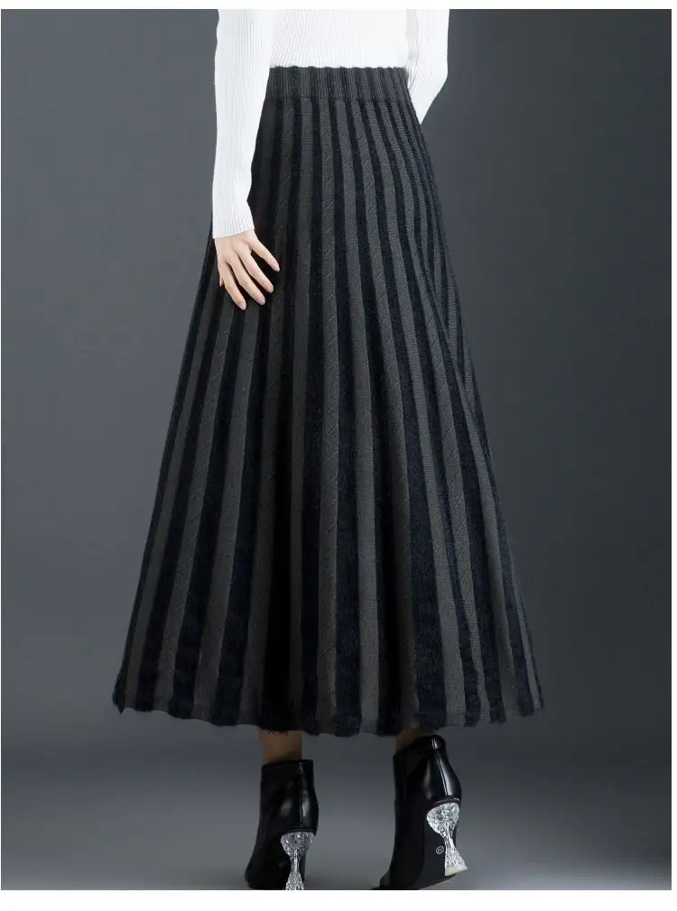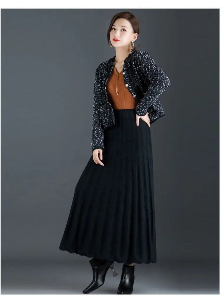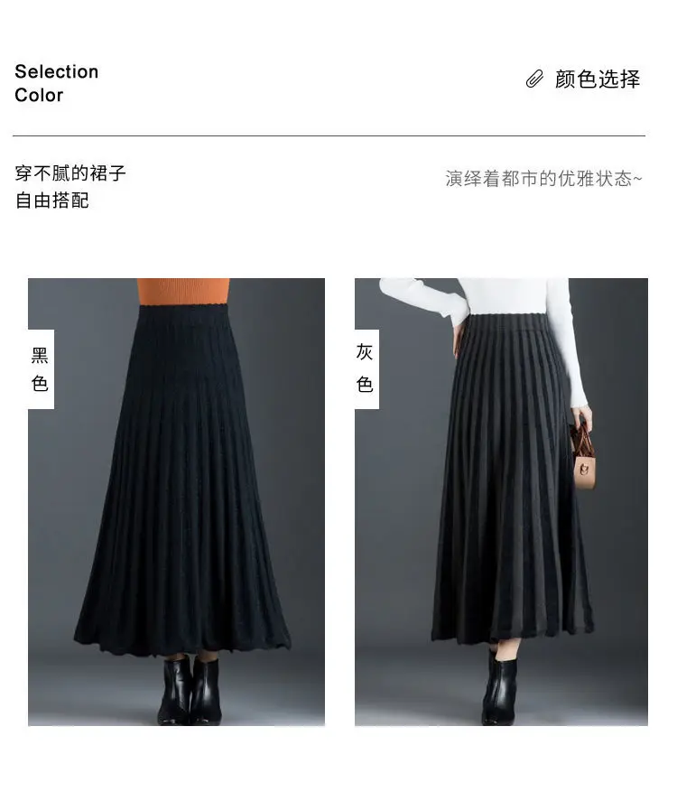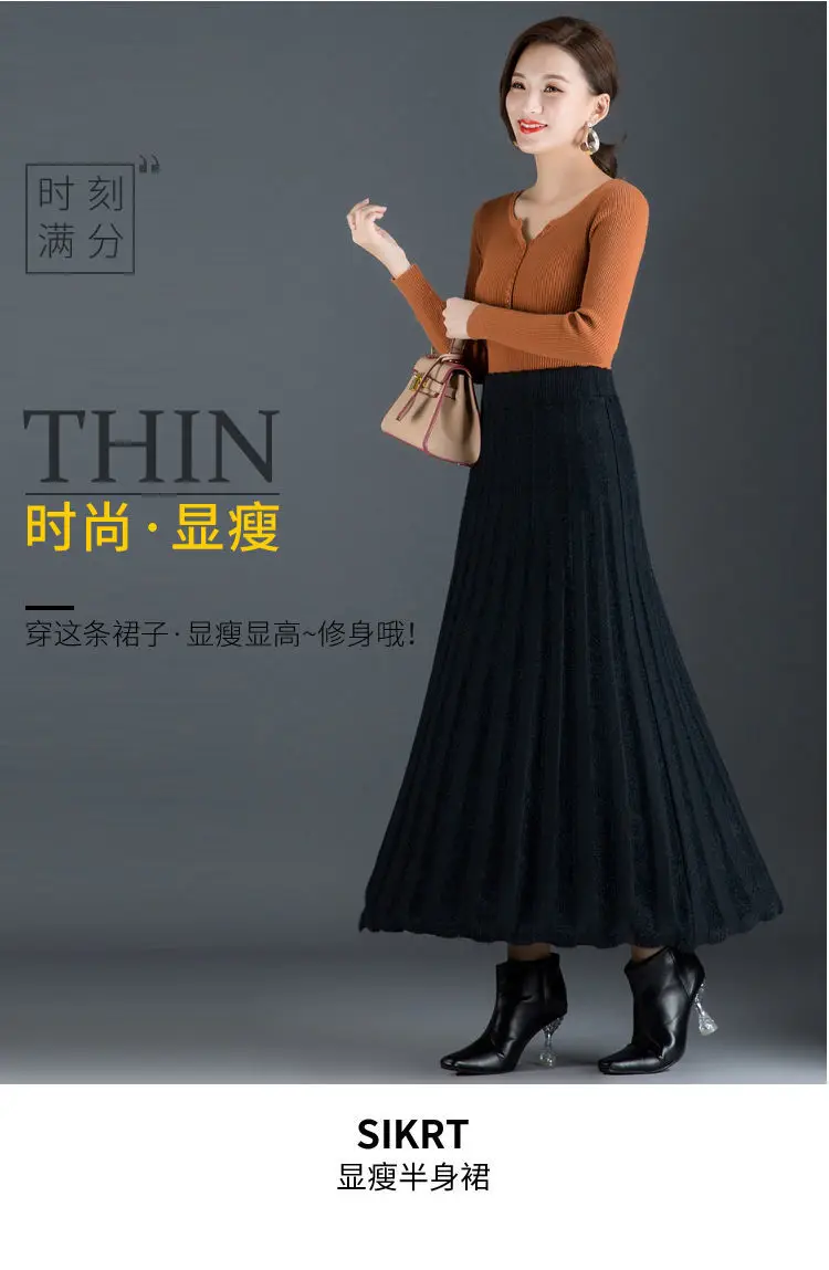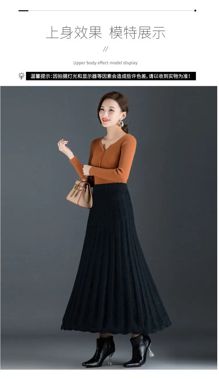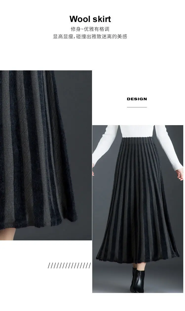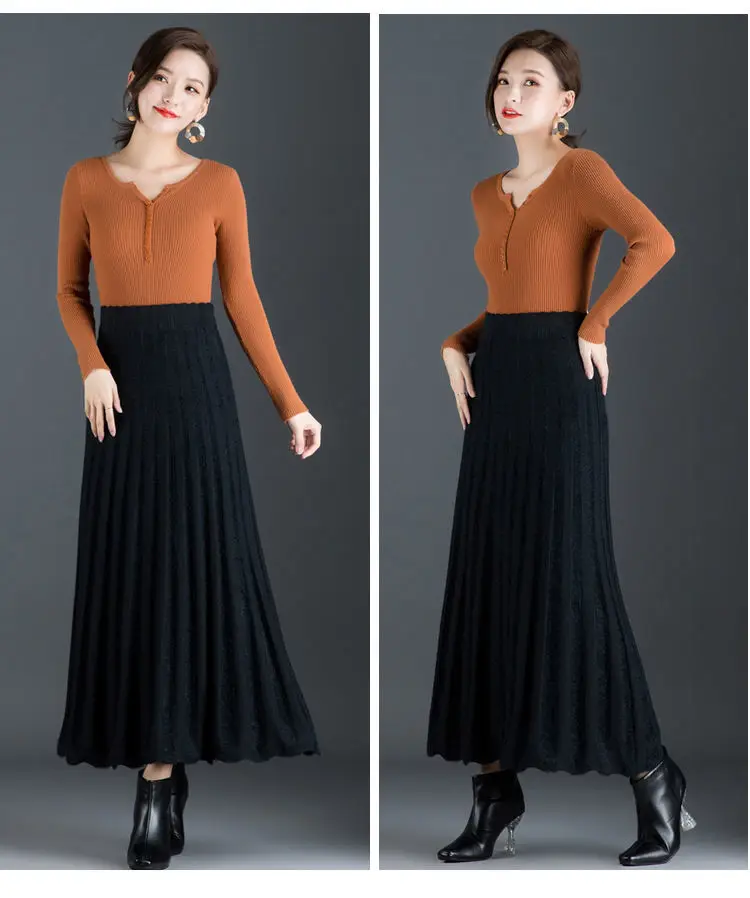 Nuova gonna lavorata a maglia sottile a trapezio spessa pieghettata in lana a vita alta autunno e inverno