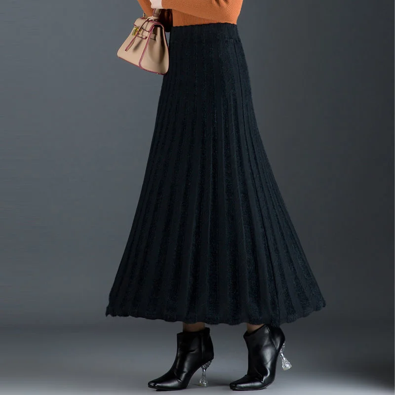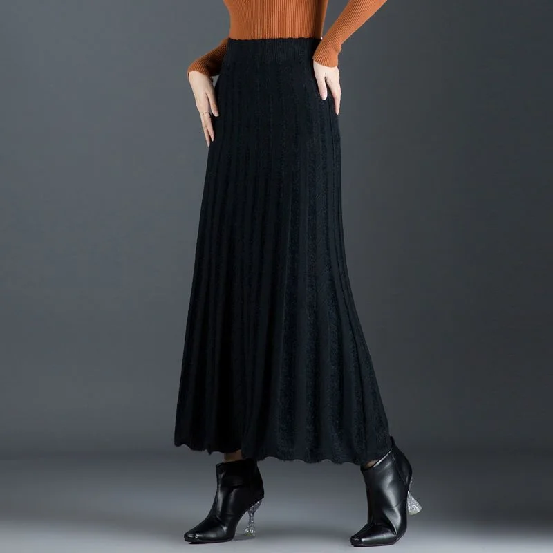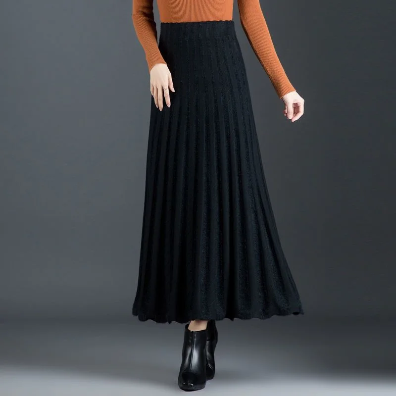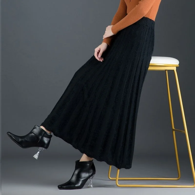 Nuova gonna lavorata a maglia sottile a trapezio spessa pieghettata in lana a vita alta autunno e inverno