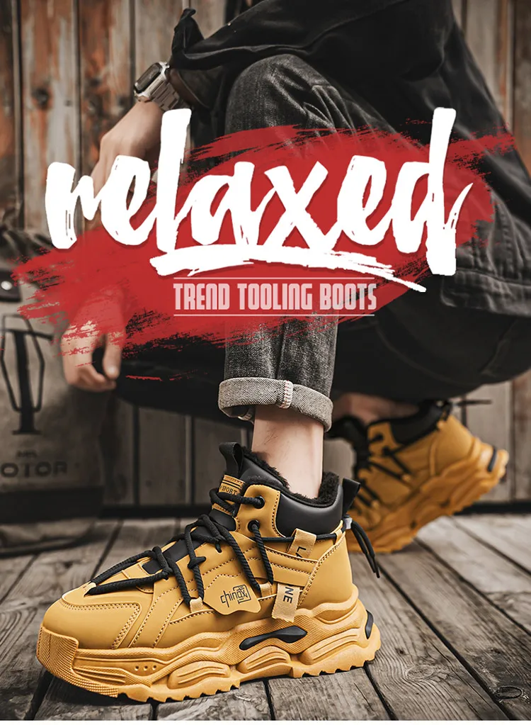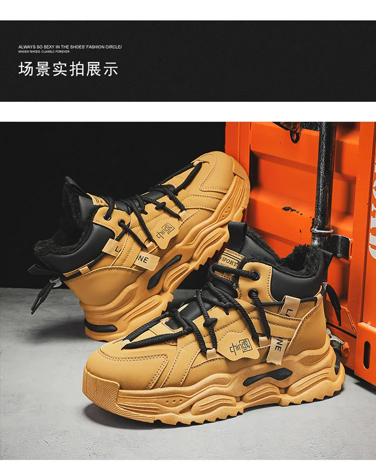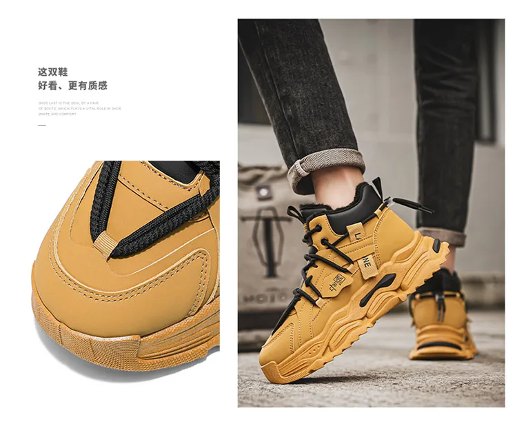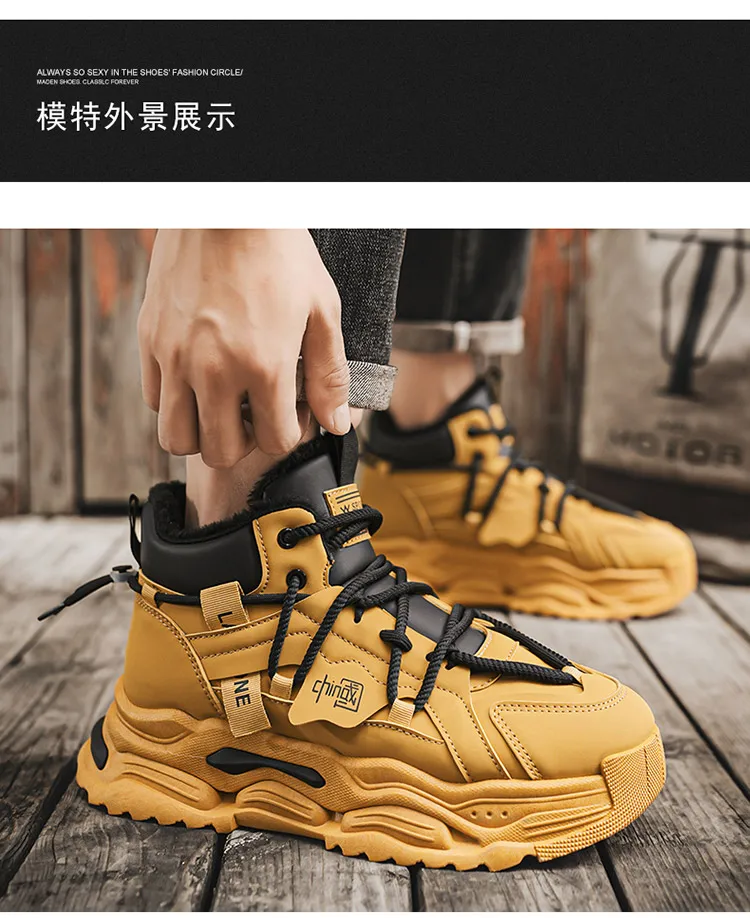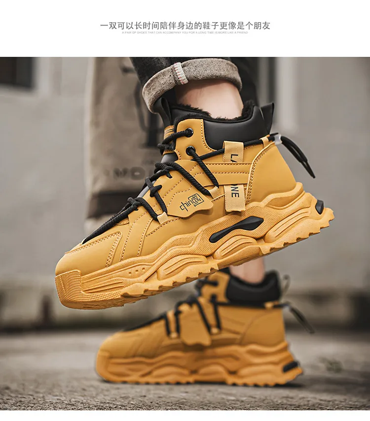 Nuove scarpe invernali da uomo alte con pile aggiunto e calore ispessito, scarpe di cotone giallo e stivali da neve integrati in pelliccia