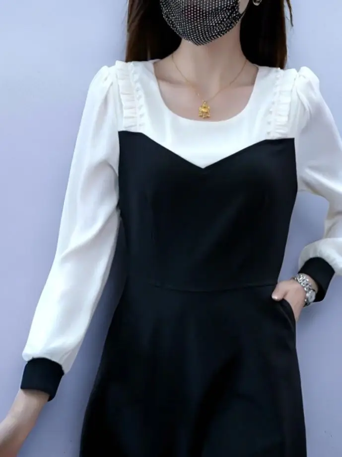 Nuovi abiti casual a maniche lunghe slim e versatili in tinta unita alla moda con scollo tondo impiombato da donna