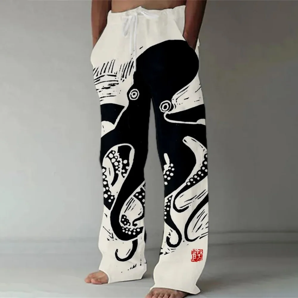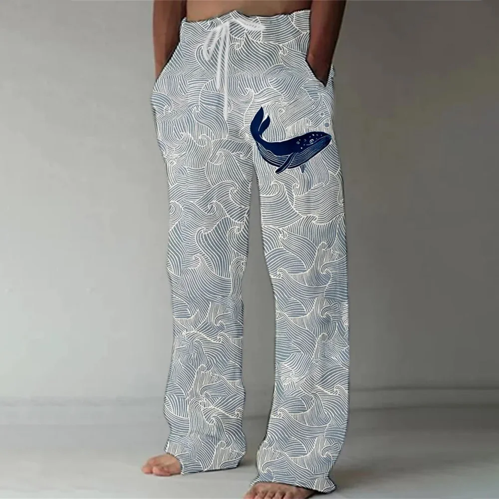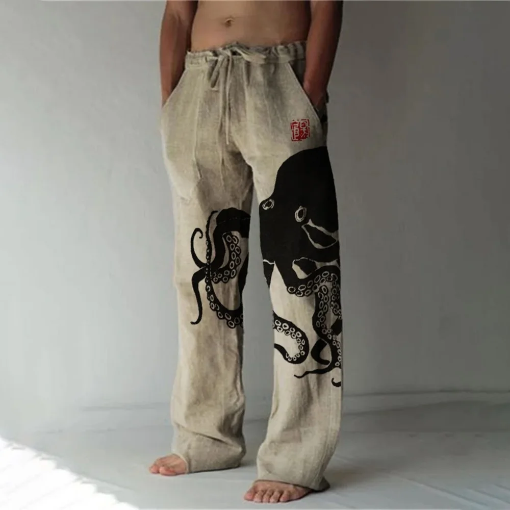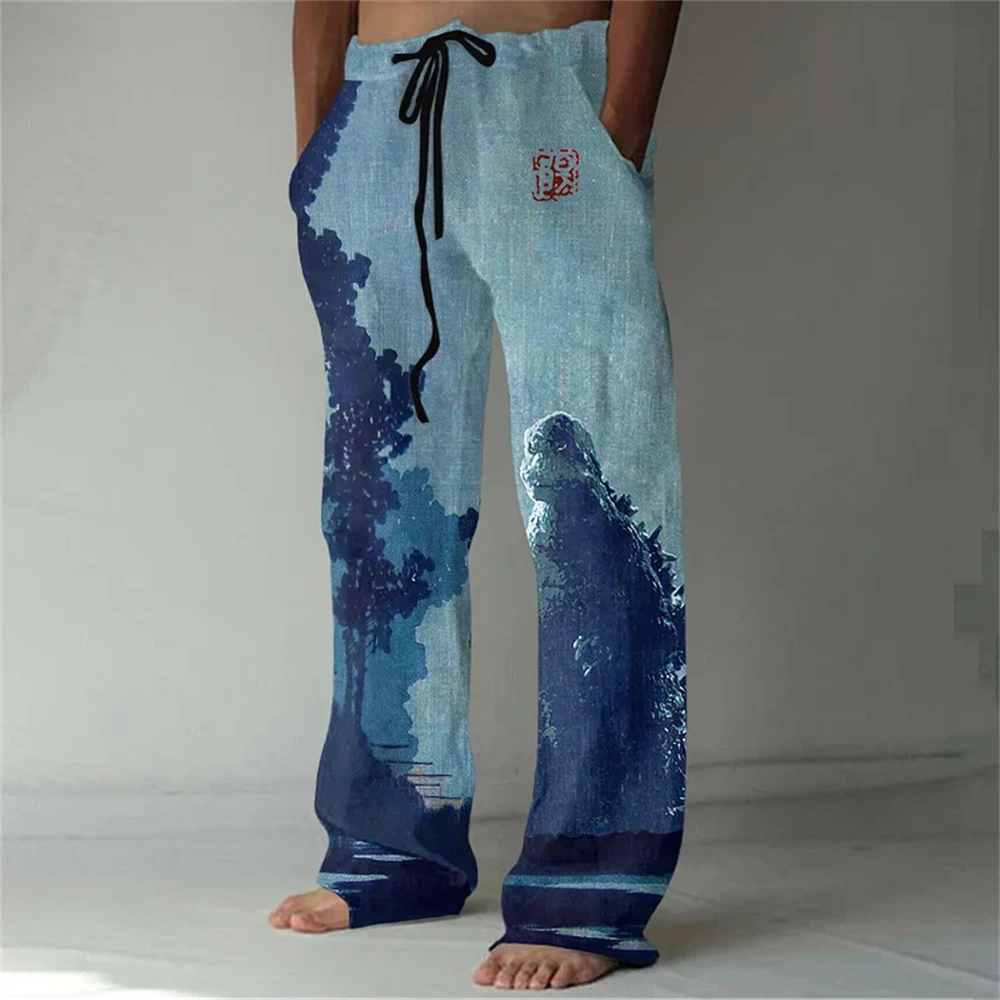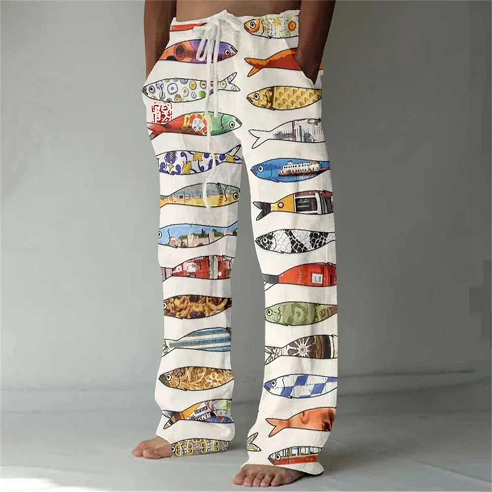 Nuovi pantaloni casual in misto lino da uomo con stampa 3D in bambù, pantaloni sportivi con coulisse tascabile casual allentati da uomo alla moda