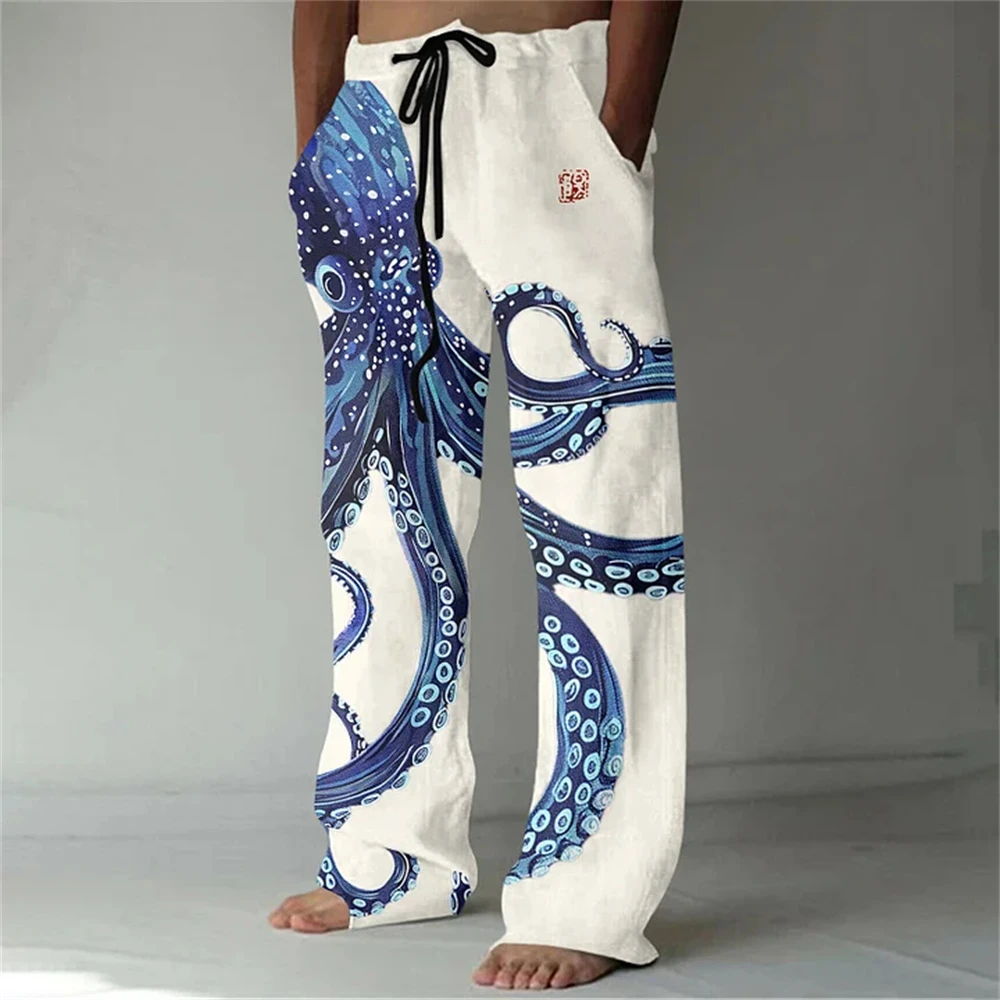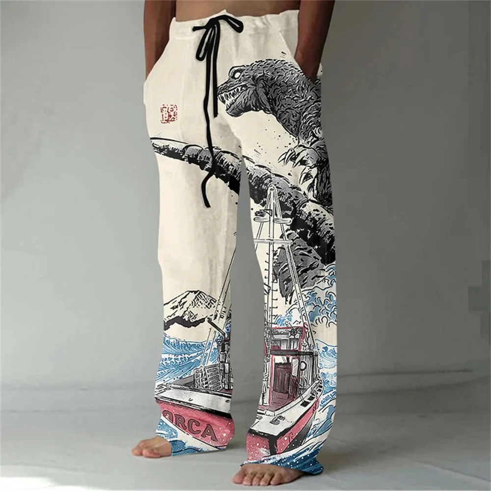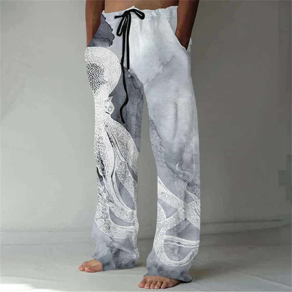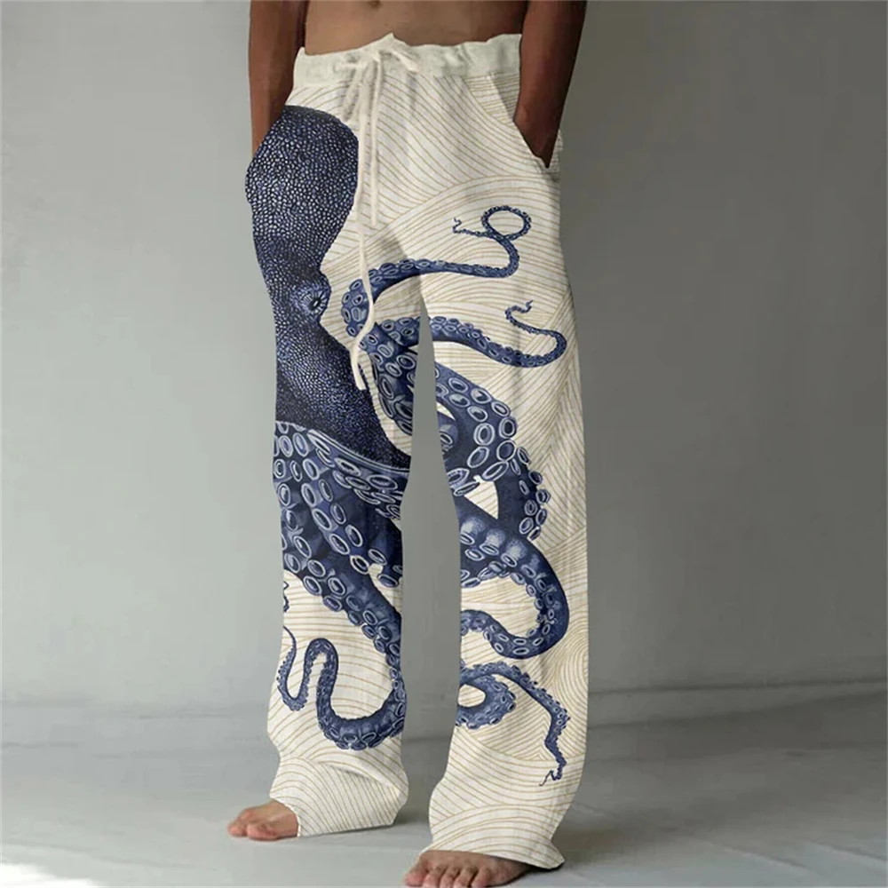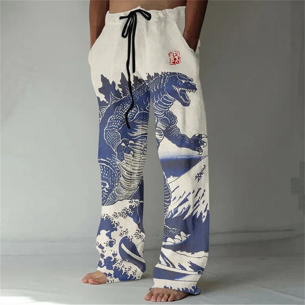 Nuovi pantaloni casual in misto lino da uomo con stampa 3D in bambù, pantaloni sportivi con coulisse tascabile casual allentati da uomo alla moda