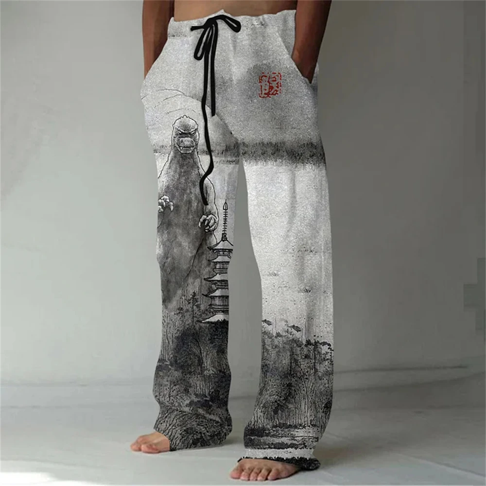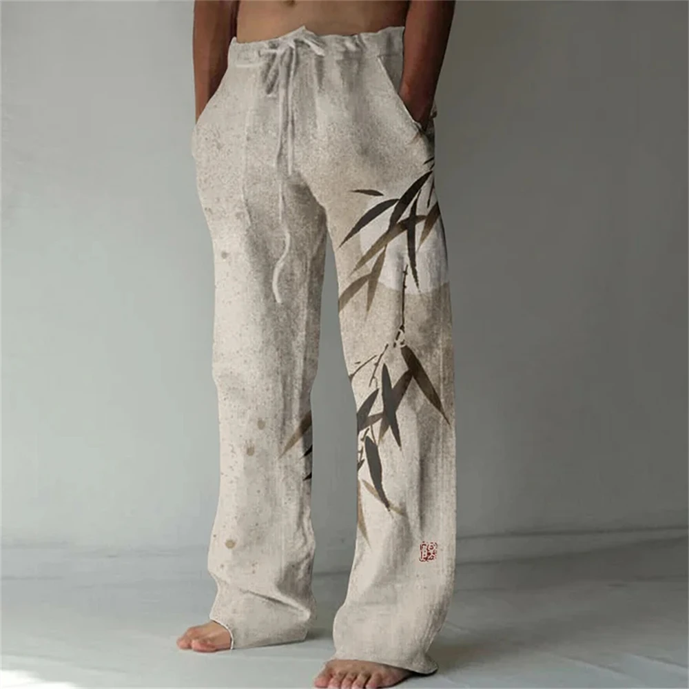 Nuovi pantaloni casual in misto lino da uomo con stampa 3D in bambù, pantaloni sportivi con coulisse tascabile casual allentati da uomo alla moda 1Nuovi pantaloni casual in misto lino da uomo con stampa 3D in bambù, pantaloni sportivi con coulisse tascabile casual allentati da uomo alla moda