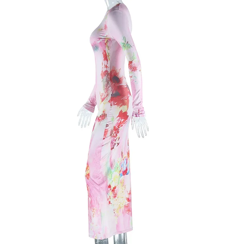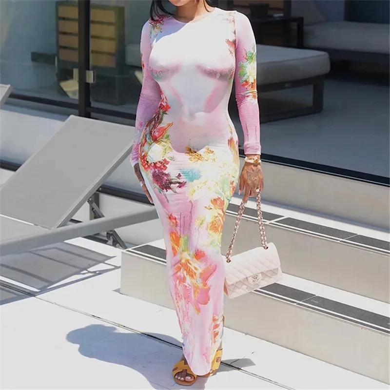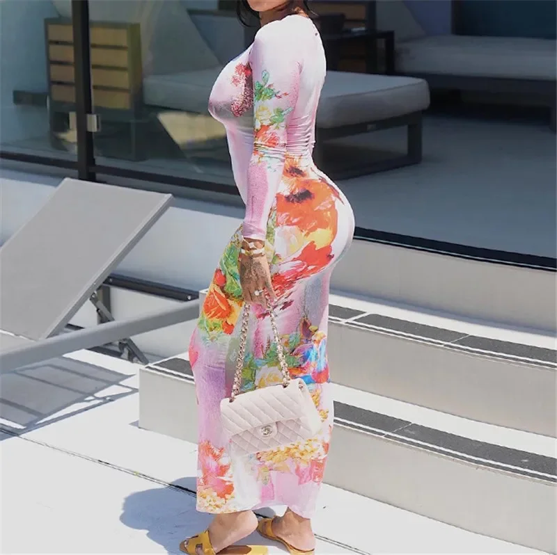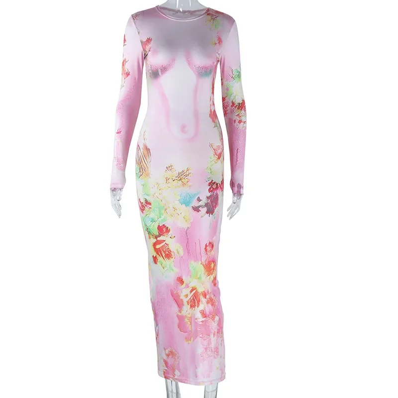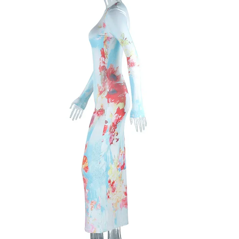 Nuovo autunno e inverno moda pianta fiore stampa slim fit pullover girocollo abito a maniche lunghe per le donne