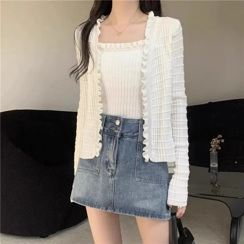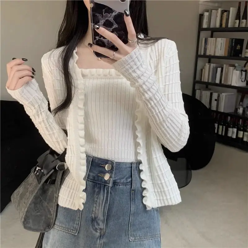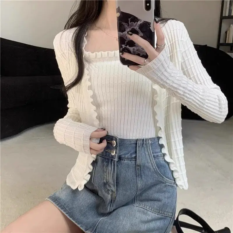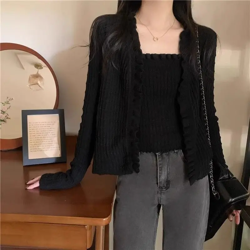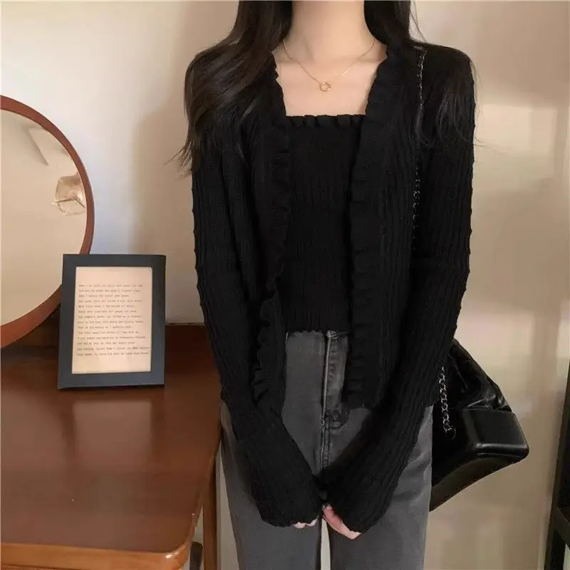 Nuovo cardigan lavorato a maglia con orecchie nere primavera autunno da donna con top corto a maniche lunghe in due pezzi