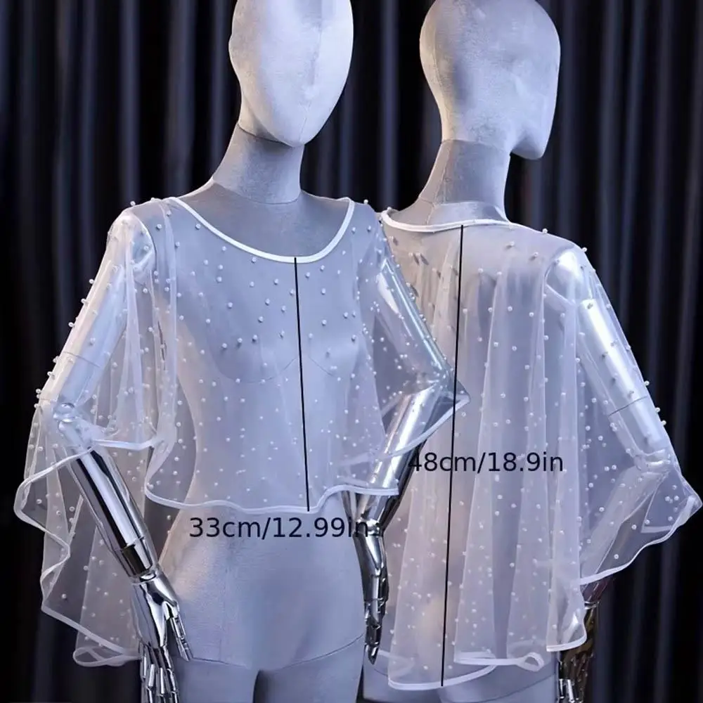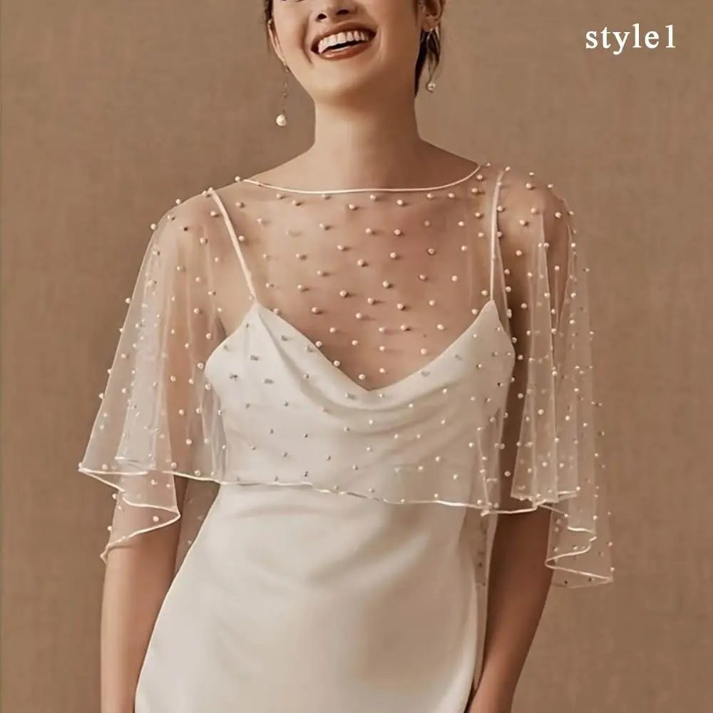 Stile manica corta con bordo in seta tinta unita Coprispalle da sposa Mantella di perle Scialle a rete in tulle di perle bianche Corto davanti lungo dietro Elegante