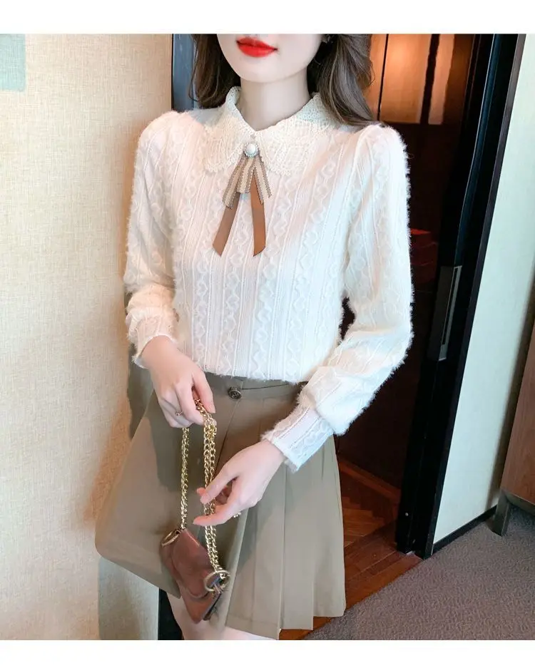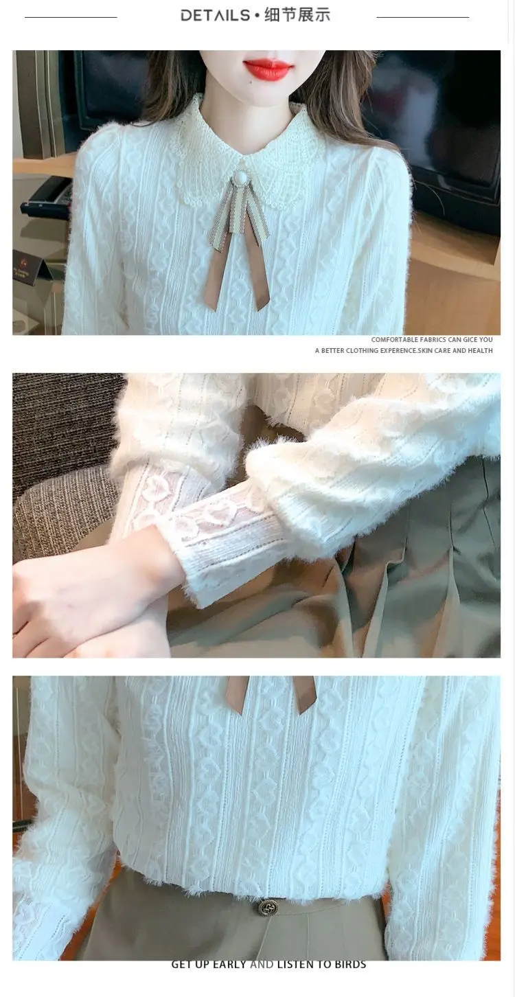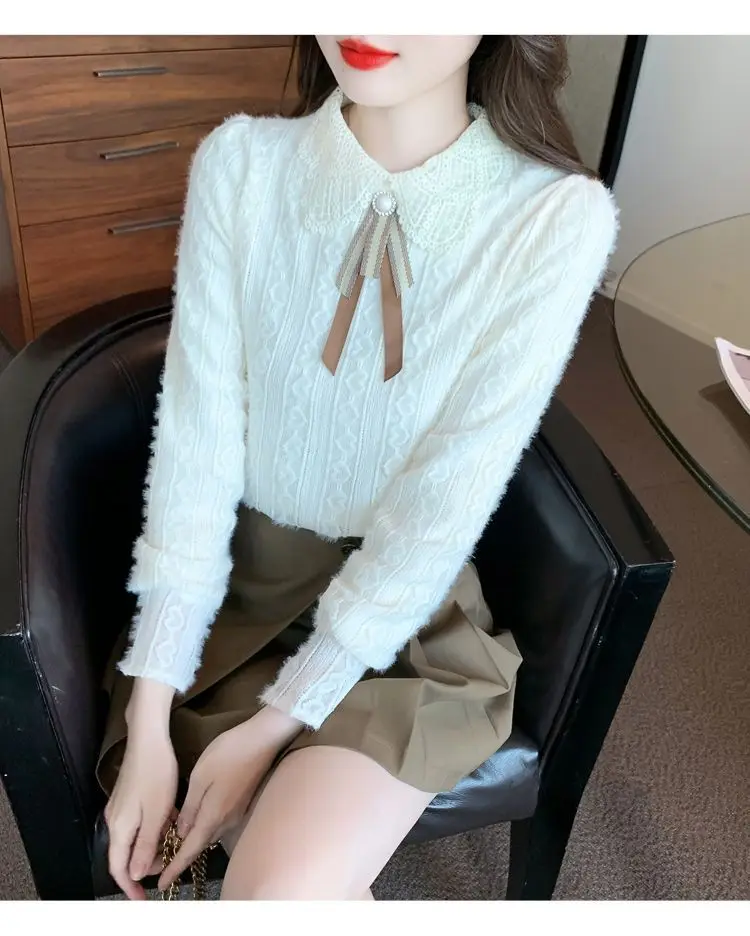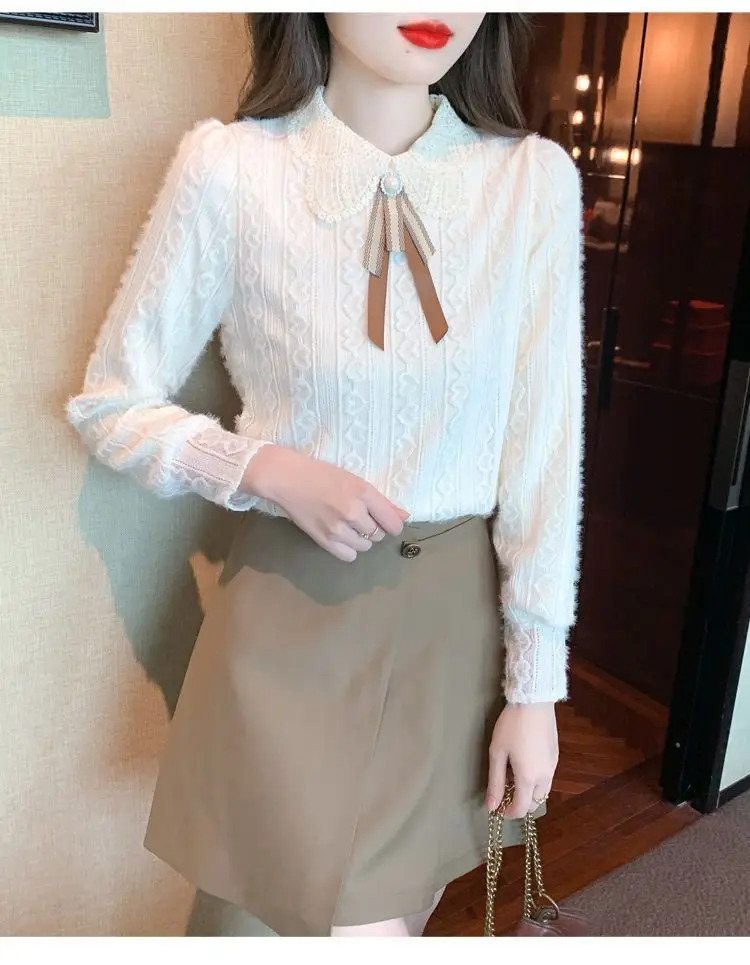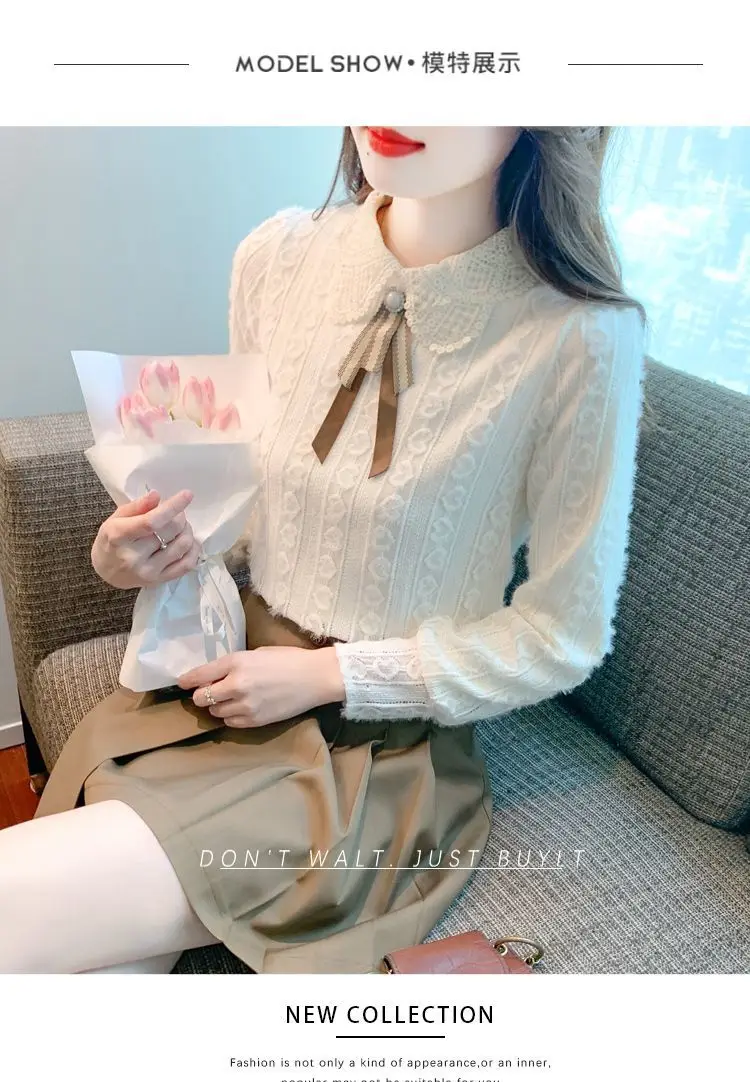 Nuovo top a maniche lunghe dolce stile floreale con colletto per bambola con base in pizzo autunno e inverno