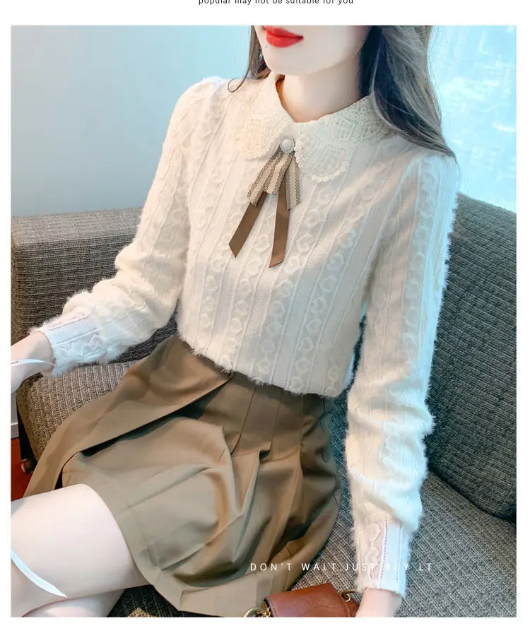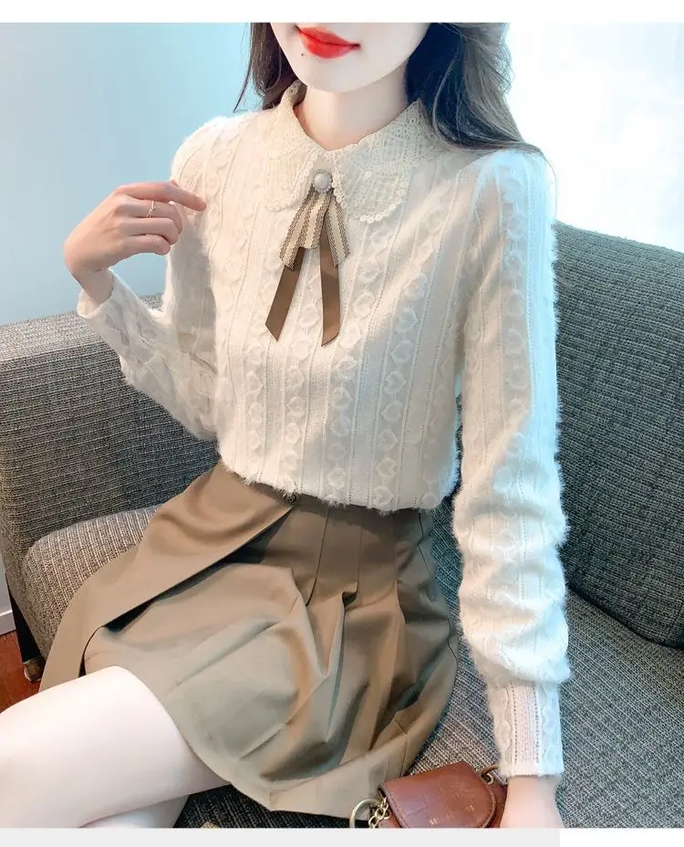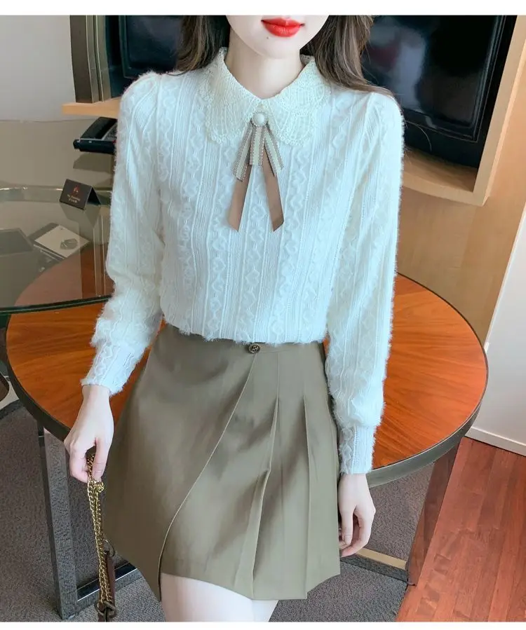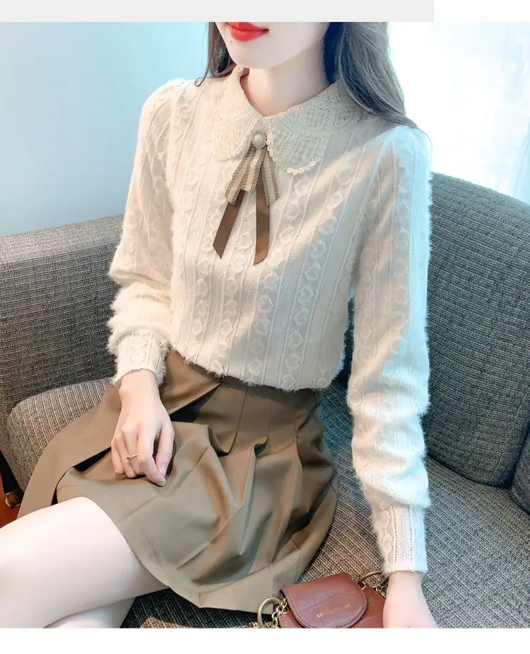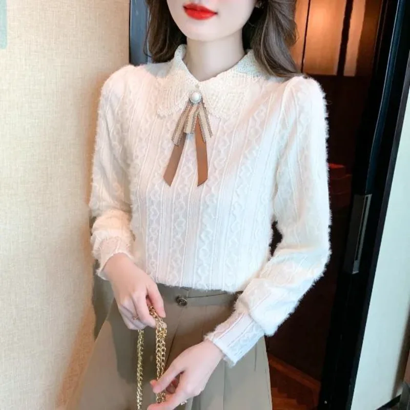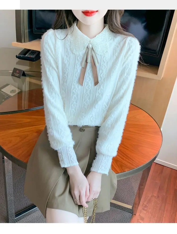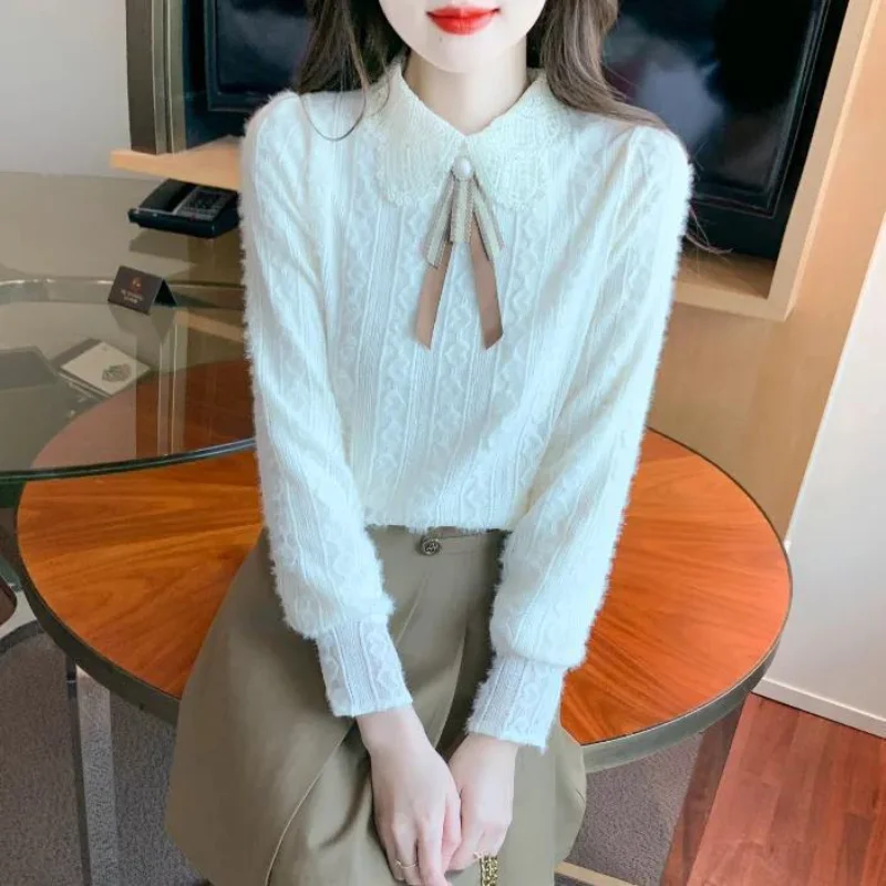 Nuovo top a maniche lunghe dolce stile floreale con colletto per bambola con base in pizzo autunno e inverno