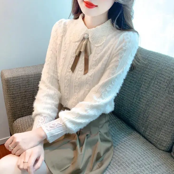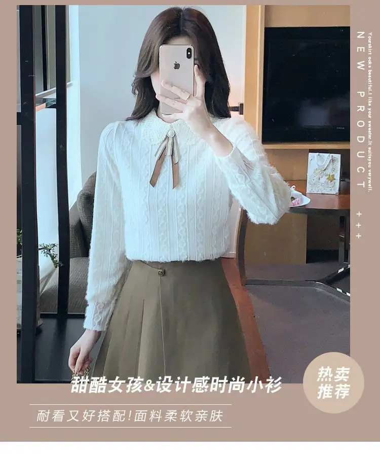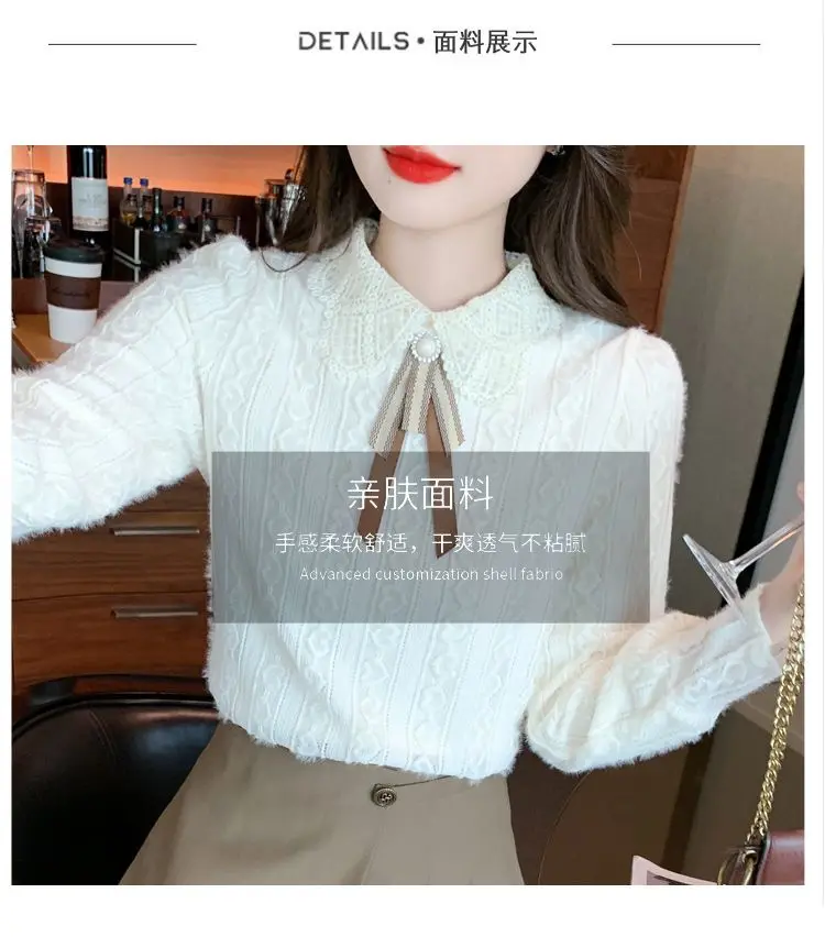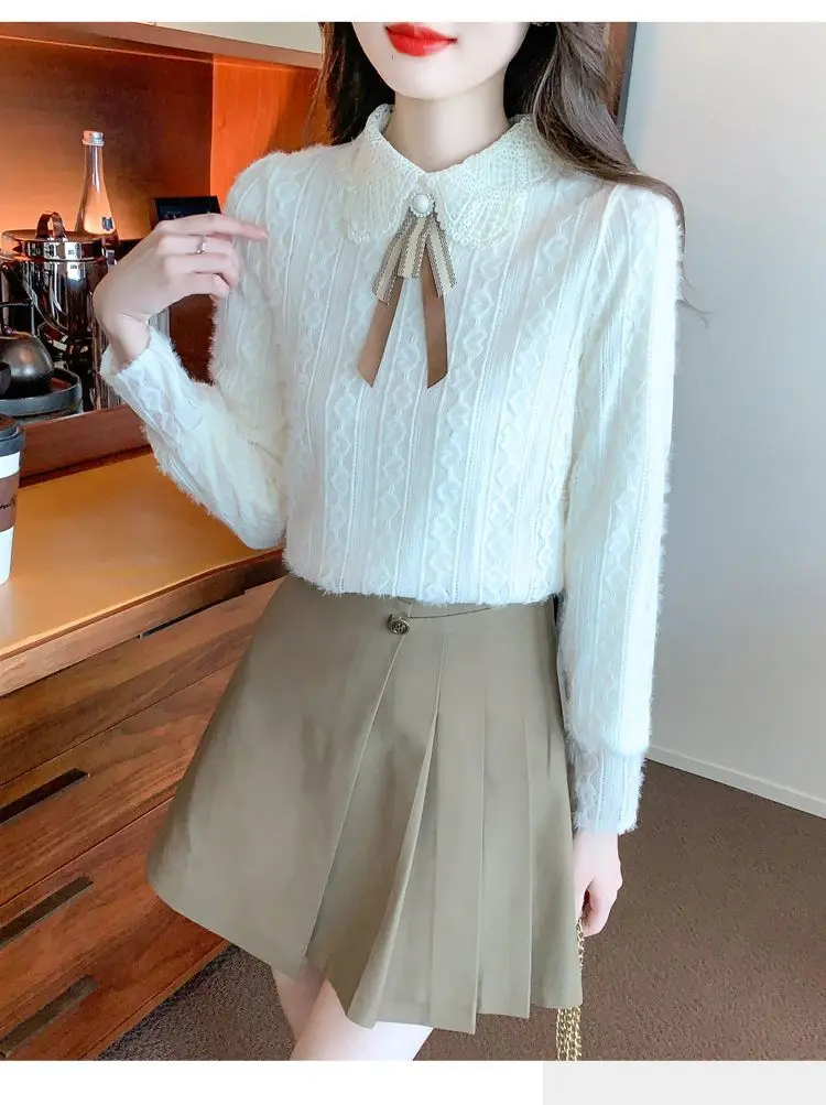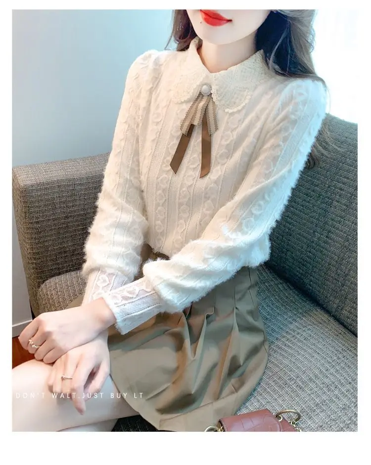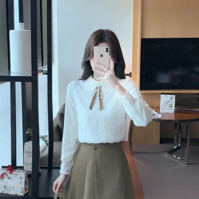 Nuovo top a maniche lunghe dolce stile floreale con colletto per bambola con base in pizzo autunno e inverno