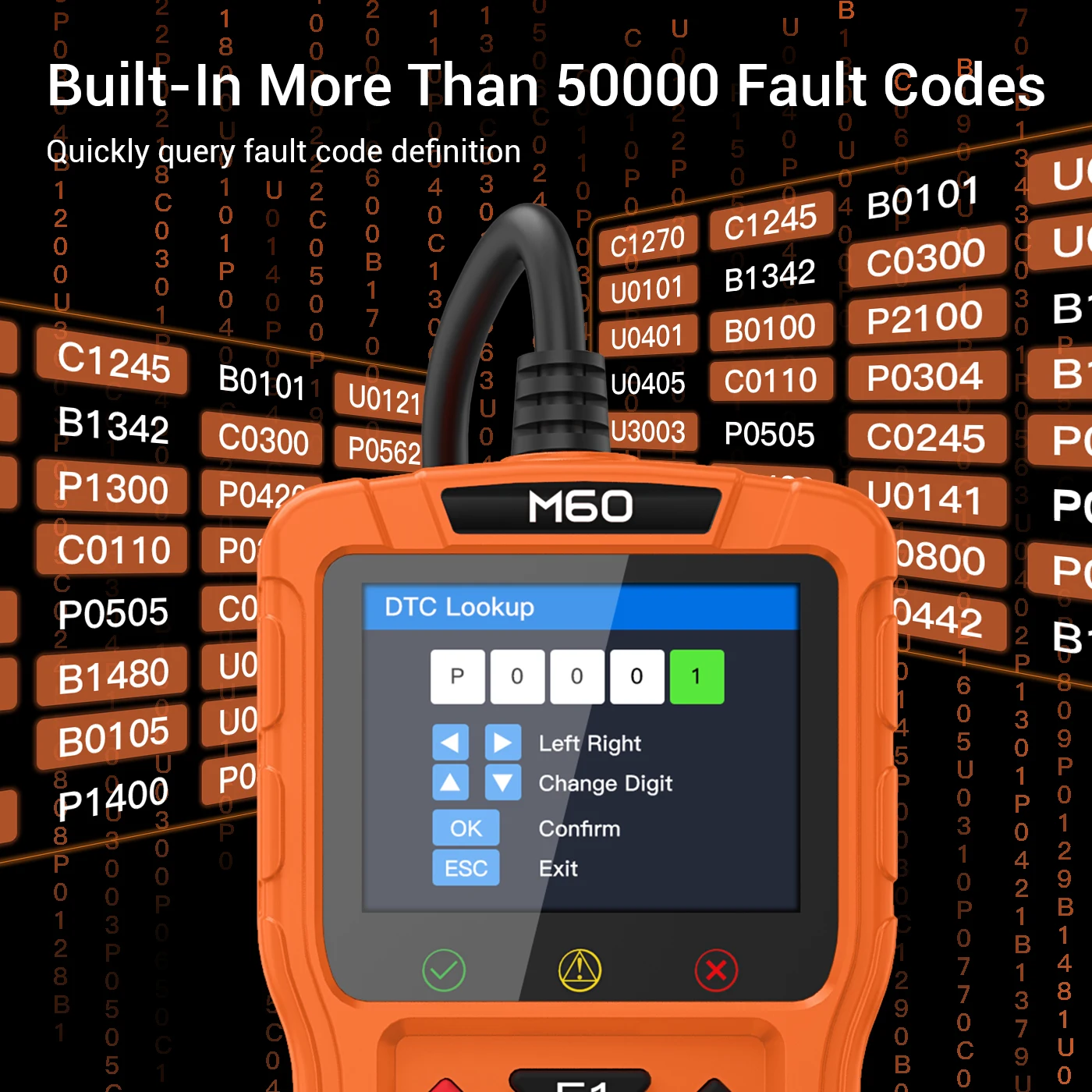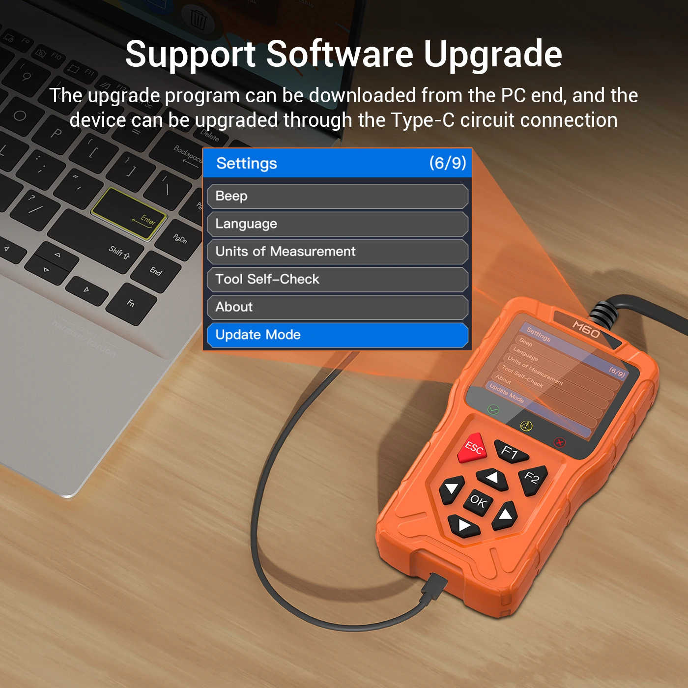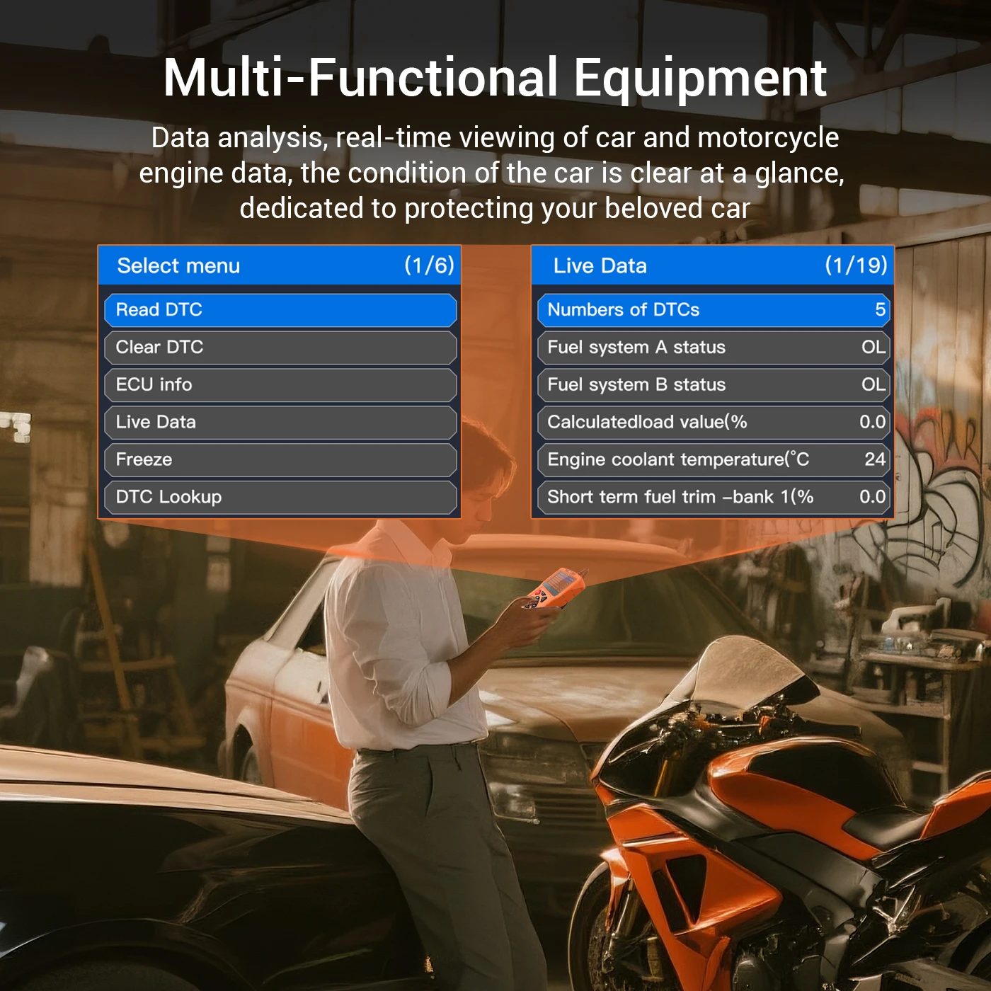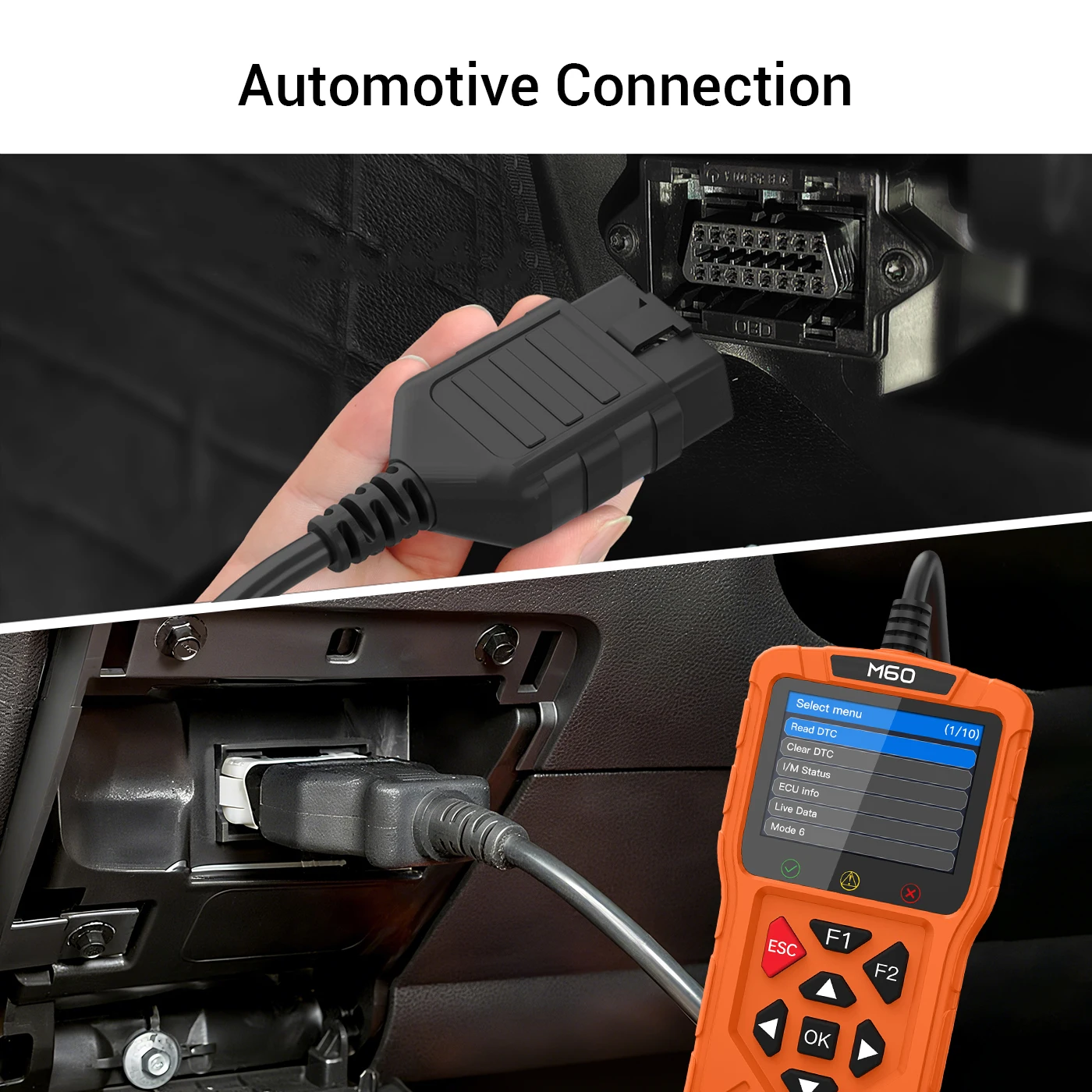 Il tester multifunzione due in uno M60 funziona con tutti i veicoli/motociclette conformi a OBD-lI, tutti i veicoli conformi a OBD-ll richiedono un connettore DLC standard a 16 pin e la certificazione OBD-ll sull’etichetta di emissione.