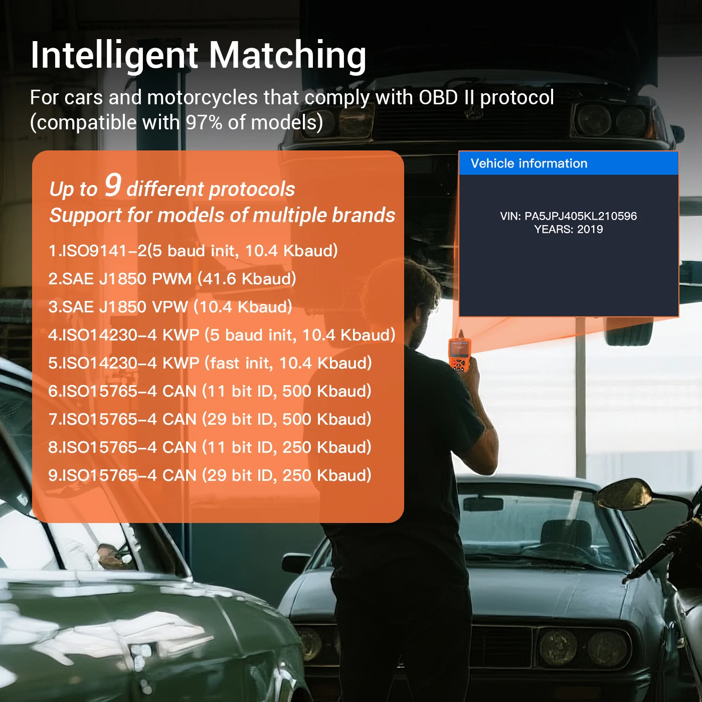 Il tester multifunzione due in uno M60 funziona con tutti i veicoli/motociclette conformi a OBD-lI, tutti i veicoli conformi a OBD-ll richiedono un connettore DLC standard a 16 pin e la certificazione OBD-ll sull’etichetta di emissione.