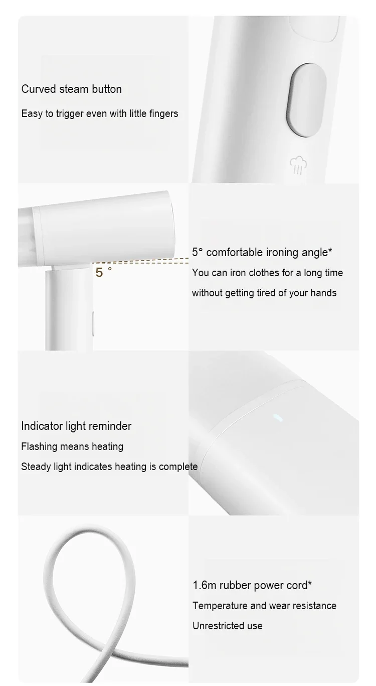 Può essere preriscaldato in 26 secondi, quindi non devi aspettare per stirare.Premere il pulsante per rilasciare il vapore e rilasciare il pulsante con il dito per fermare l’alimentazione del vapore per impedire il vapore residui di scaldare la pelle.