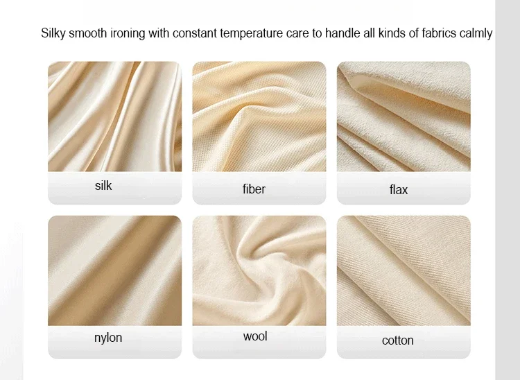 *Nota: non stirare tessuti in pelle;quando stirare tessuti di lana o fibra sintetica, stirare la schiena per evitare strisce fluide;quando stirare tessuti di seta, posizionare un panno morbido o un asciugamano in cima per un stiratura isolata per evitare il pannello viene nel contatto diretto con il tessuto di seta che causano i danni.