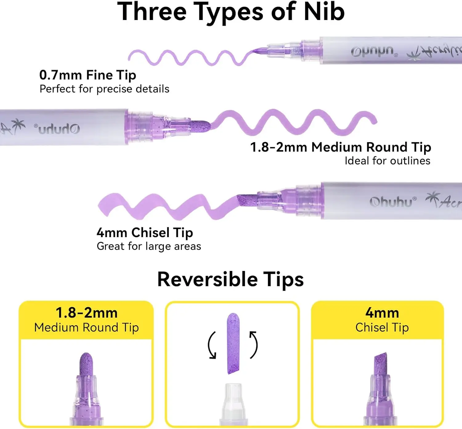 Ogni confezione include una confezione da 24 penne acriliche a punta fine da 0,7 mm per la pittura e una confezione da 24 pennarelli a punta reversibile, con punte medie rotonde (1,8-2 mm) e punte a scalpello da 4 mm.Per cambiare consiglio è sufficiente tirare il pennino per rivelare uno dei due lati.Usa le punte rotonde e scalpello per tratti ampi e le punte sottili per dettagli intricati come delineare e abbellire.