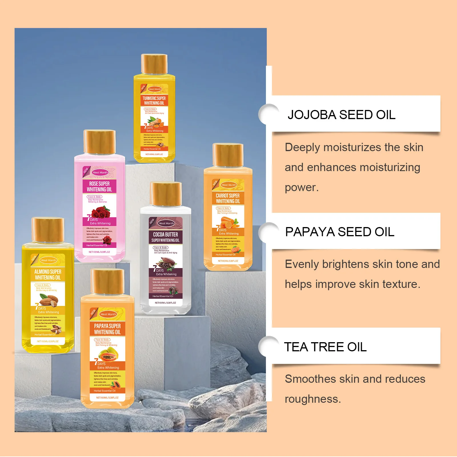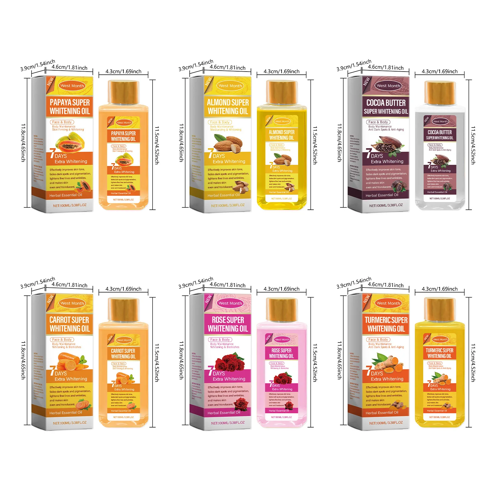 1.La nostra serie di oli per la cura del corpo migliora il tono della pelle, alleggerisce le macchie scure e la pigmentazione, riduce le linee sottili e le rughe e fornisce un extra sbiancante per la pelle.