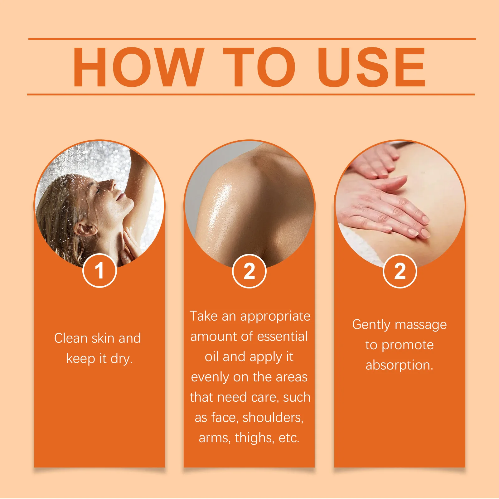 2.Prendi una quantità appropriata di olio essenziale e si applica anche sulle aree che necessitano di cura, come viso, spalle, braccia, cosce, ecc.