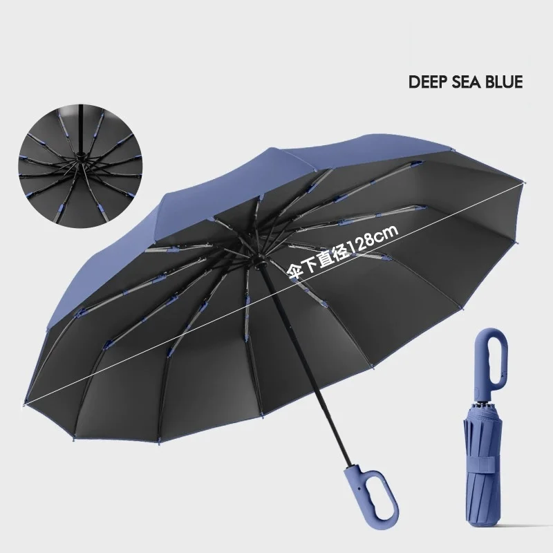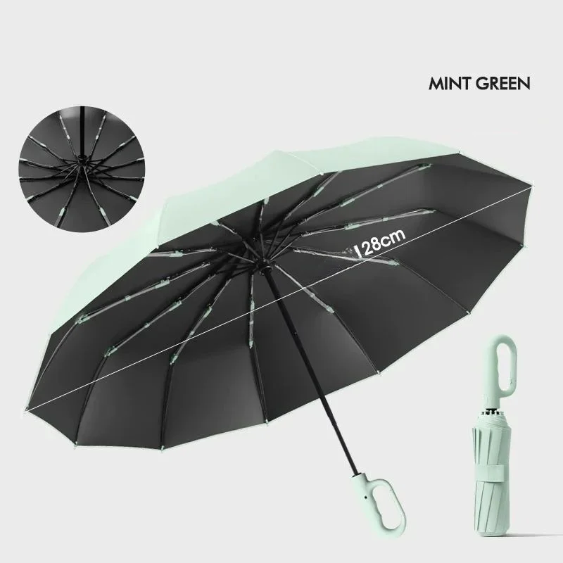 Ombrello extra large con fibbia ad anello a 12 ossa in avanti, completamente automatico, portatile, resistente al vento, pieghevole a doppio scopo, colla nera antipioggia