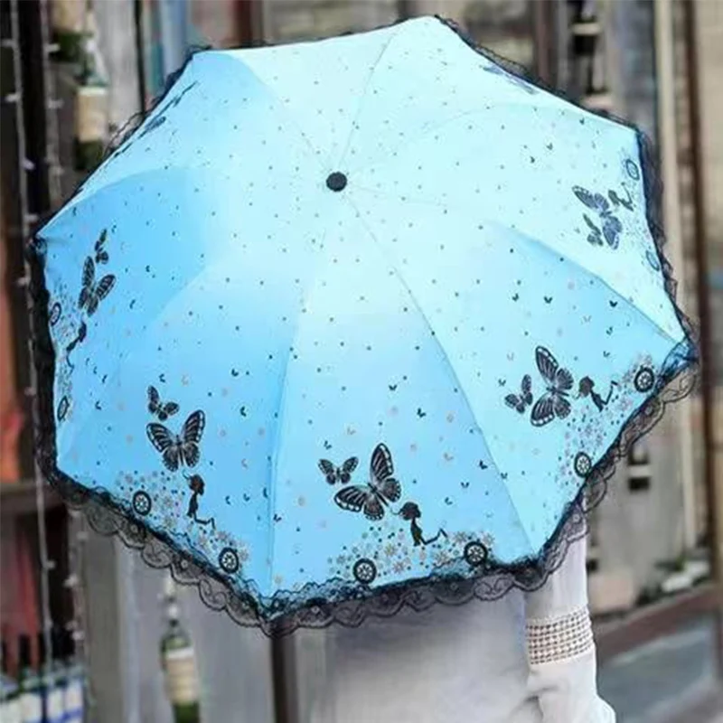 Ombrello parasole stampato in pizzo a farfalla per entrambi i pioggia Ombrello in gomma nera resistente al vento e resistente al sole