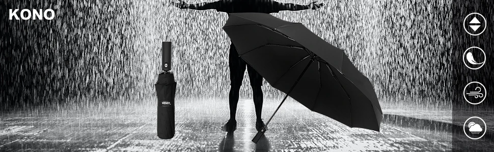 Ombrello automatico per operazioni con una sola mano: l’ombrello KONO si apre e si chiude al tocco di un pulsante, consente di azionarlo con una sola mano. Ideale per situazioni in cui le tue mani sono piene o quando hai bisogno di uscire rapidamente dalla macchina senza bisogno di combattere con un ombrello convenzionale.